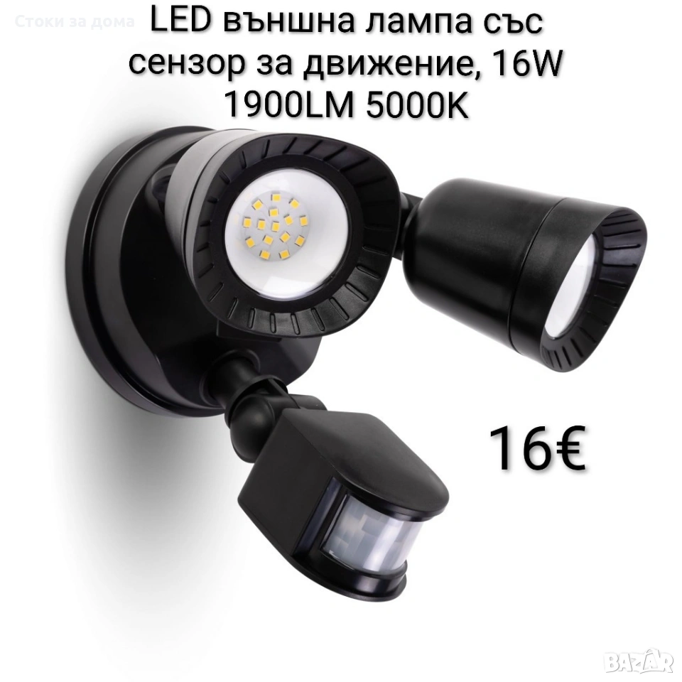 LED външна лампа със сензор за движение, 16W 1900LM 5000K, 2 лампи