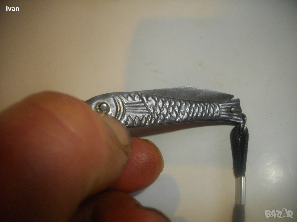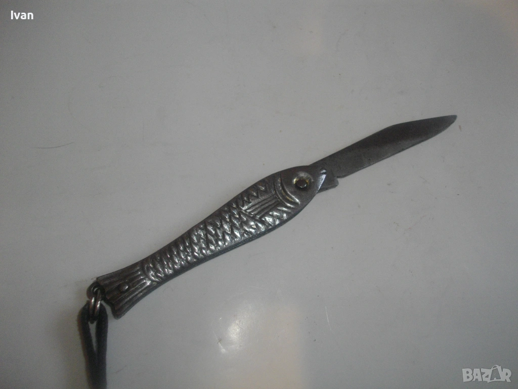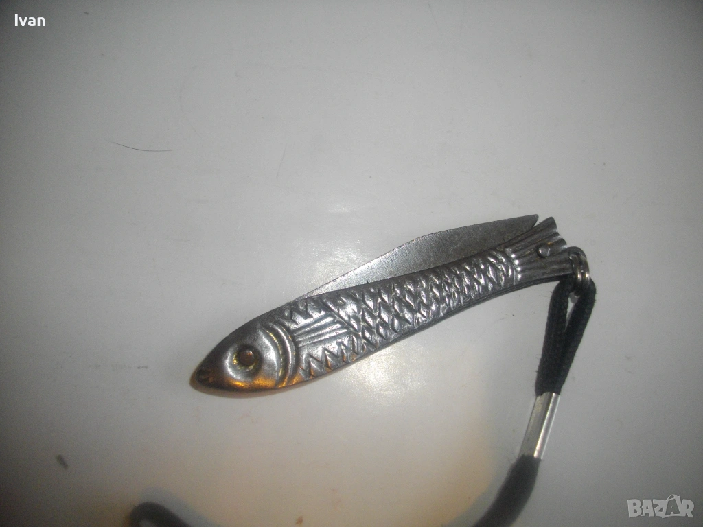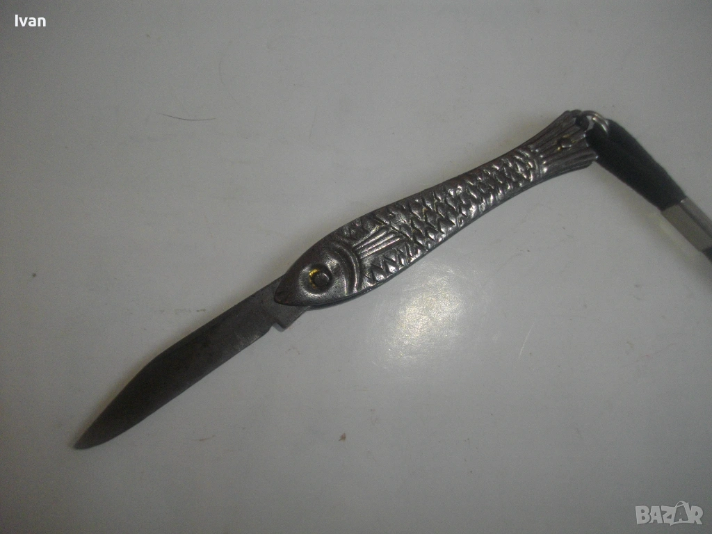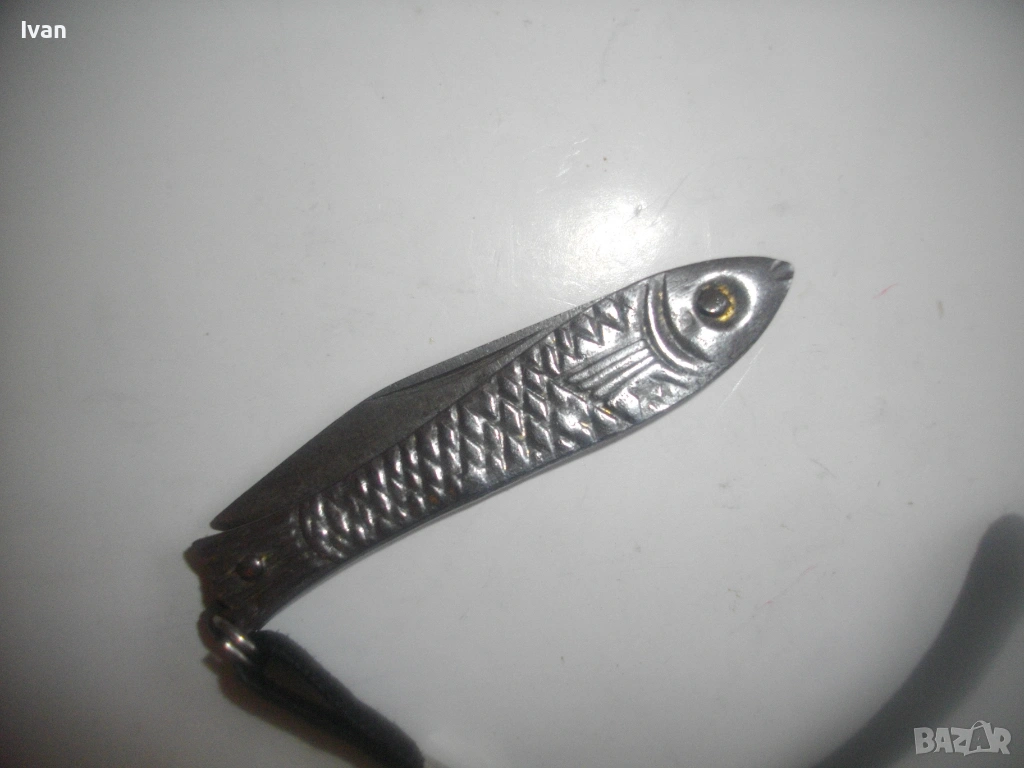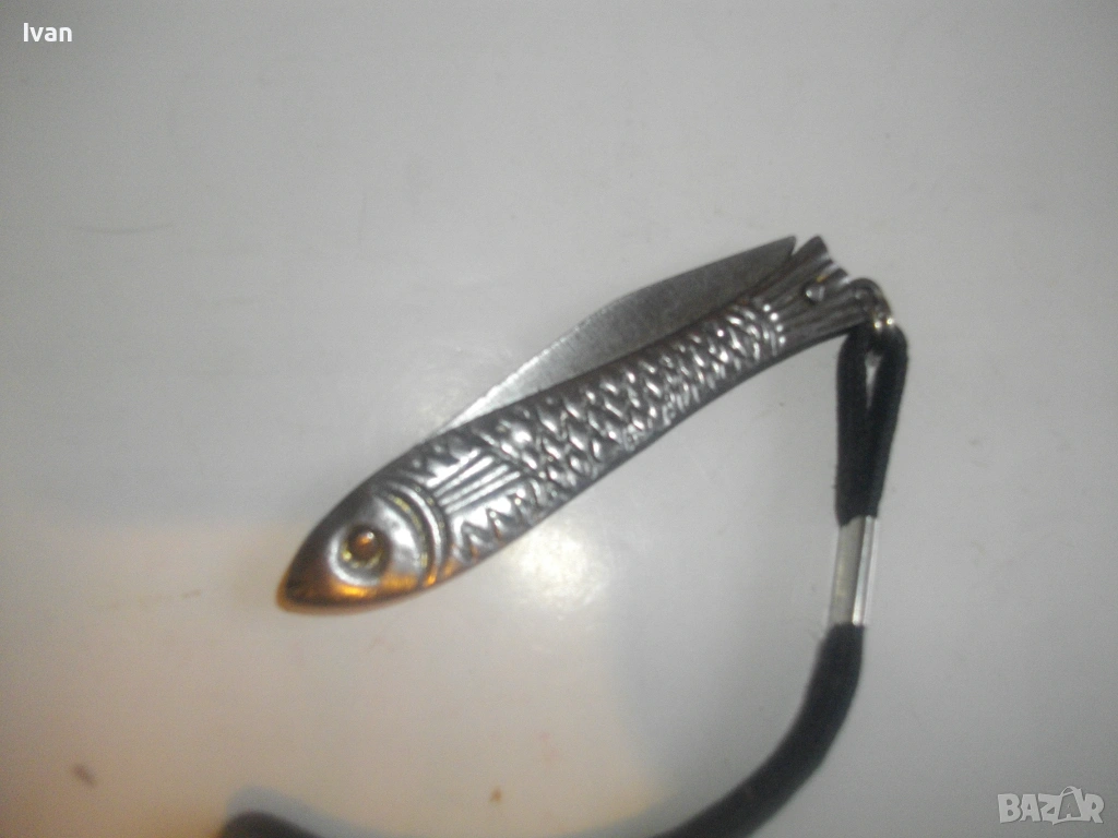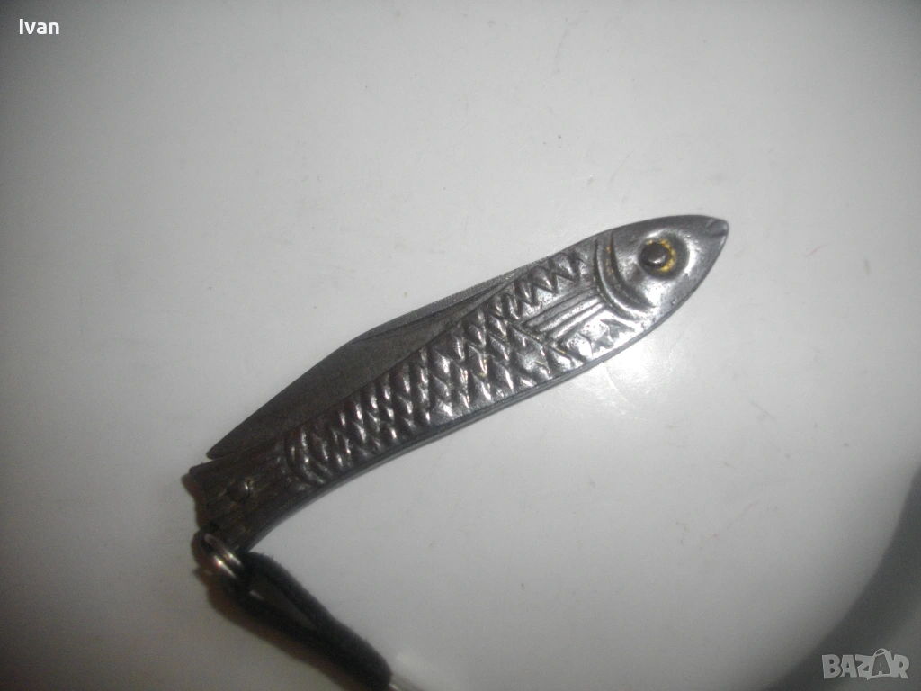 Българска малка, сувенирна джобна ножка ножче, метално изцяло, с форма на риба.