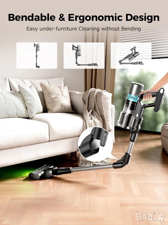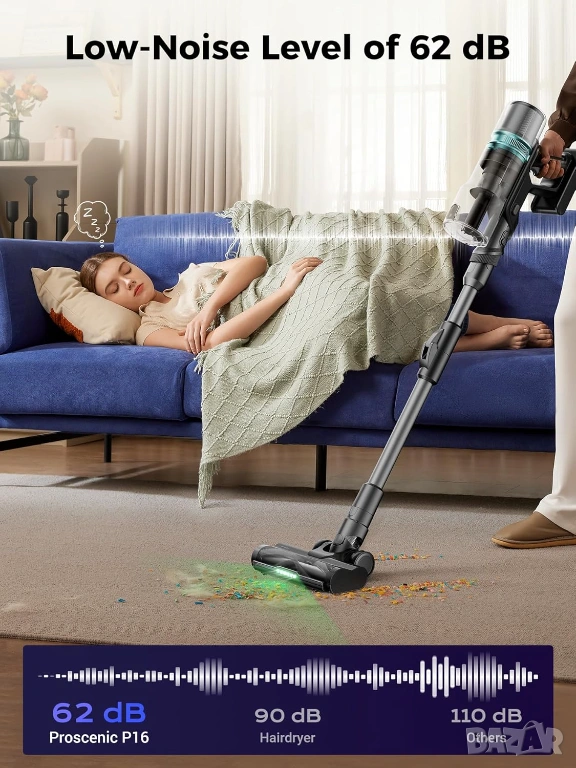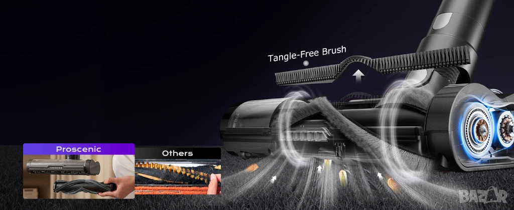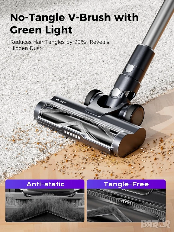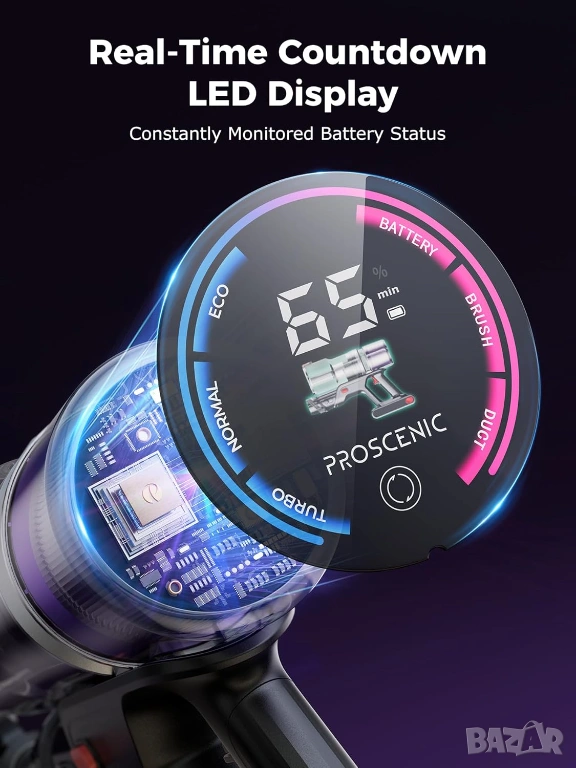 【55Kpa Мощно засмукване за дълбоко почистване】Безжичната прахосмукачка Proscenic осигурява силно засмукване от 55Kpa/550W, премахвайки без усилие прах, отломки и косми от домашни любимци от твърди подове, килими и други. Перфектно подходяща за всяка ситуация, тя осигурява цялостно почистване всеки път.