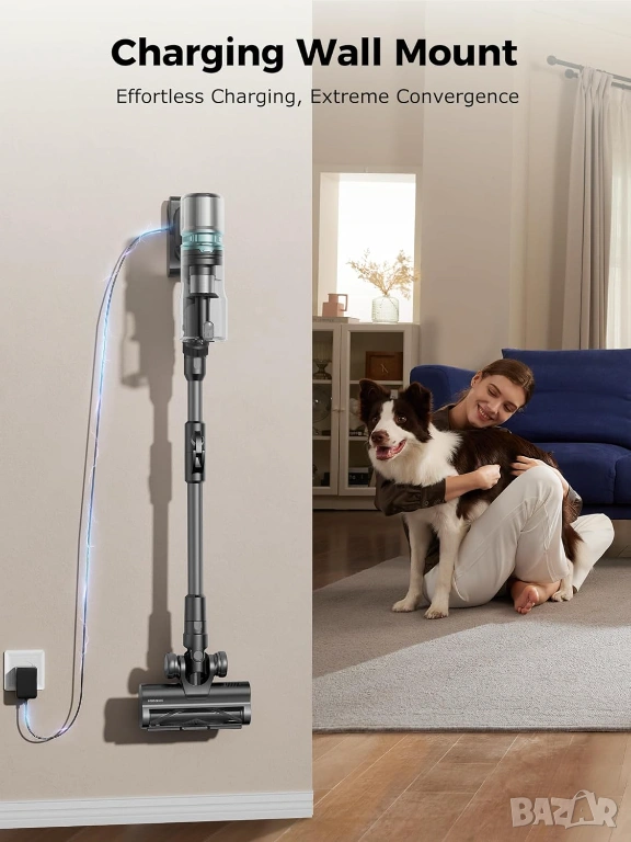 Зареждане и съхранение за стенен монтаж Прахосмукачката се предлага с удобна докинг станция за зареждане за стенен монтаж. Просто я окачете след употреба за автоматично зареждане и съхранявайте включения накрайник за цепнатини спретнато на стойката, за да поддържате всички аксесоари организирани и готови за употреба.