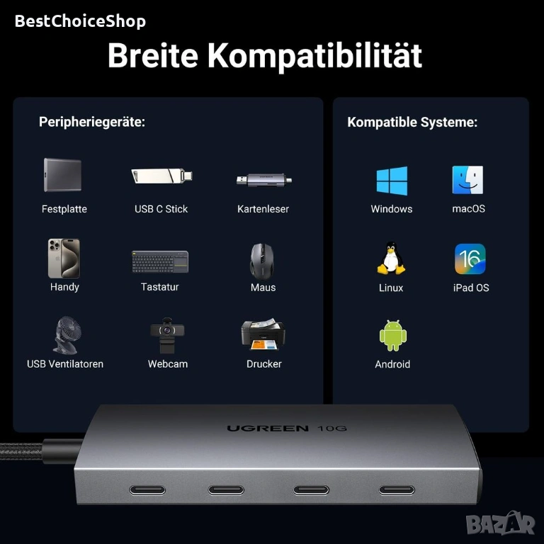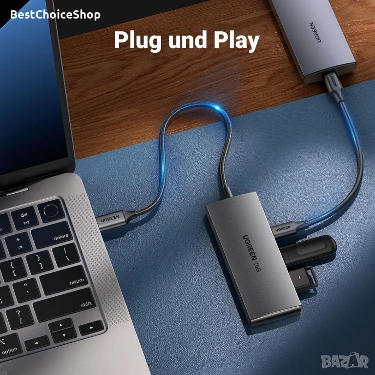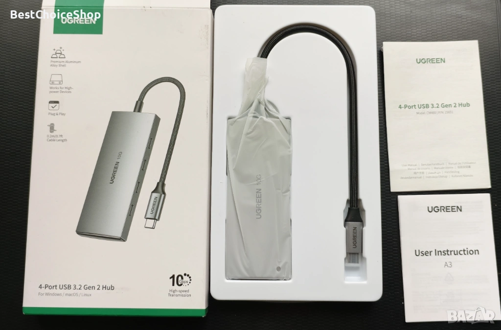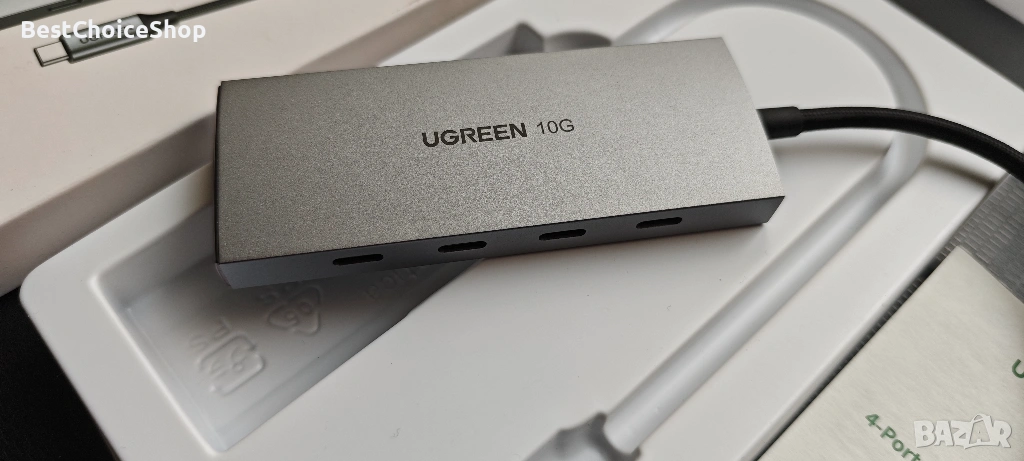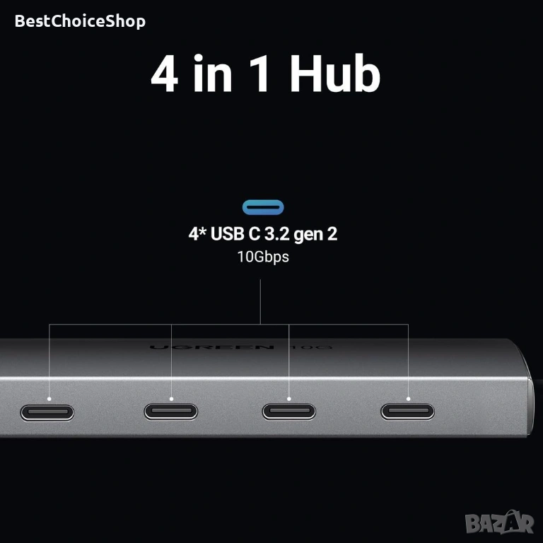 Продавам високоскоростен USB хъб UGREEN CM480 с 4 порта USB 3.2 Gen 2 и скорост на трансфер до 10Gbps. Подходящ за свързване на външни SSD дискове, флашки, периферия и други устройства с висока пропускателна способност.