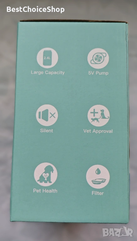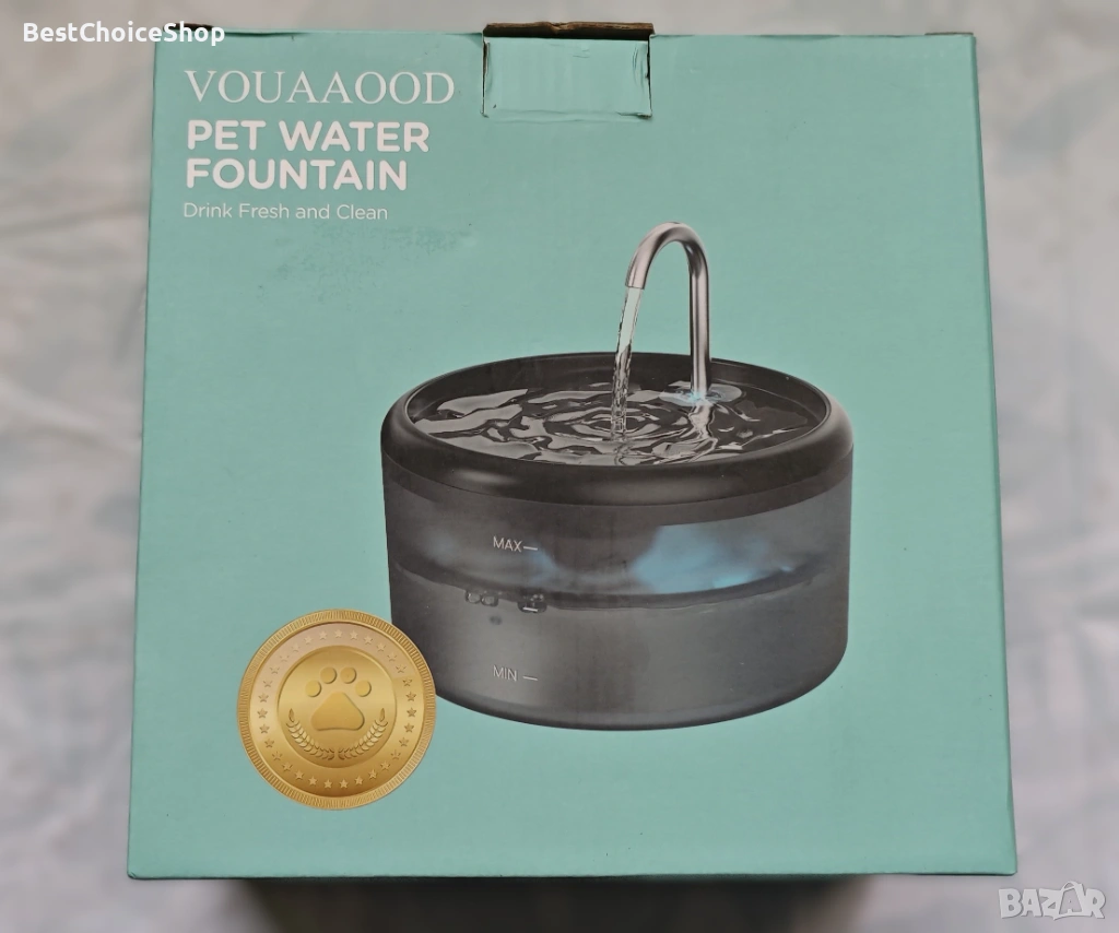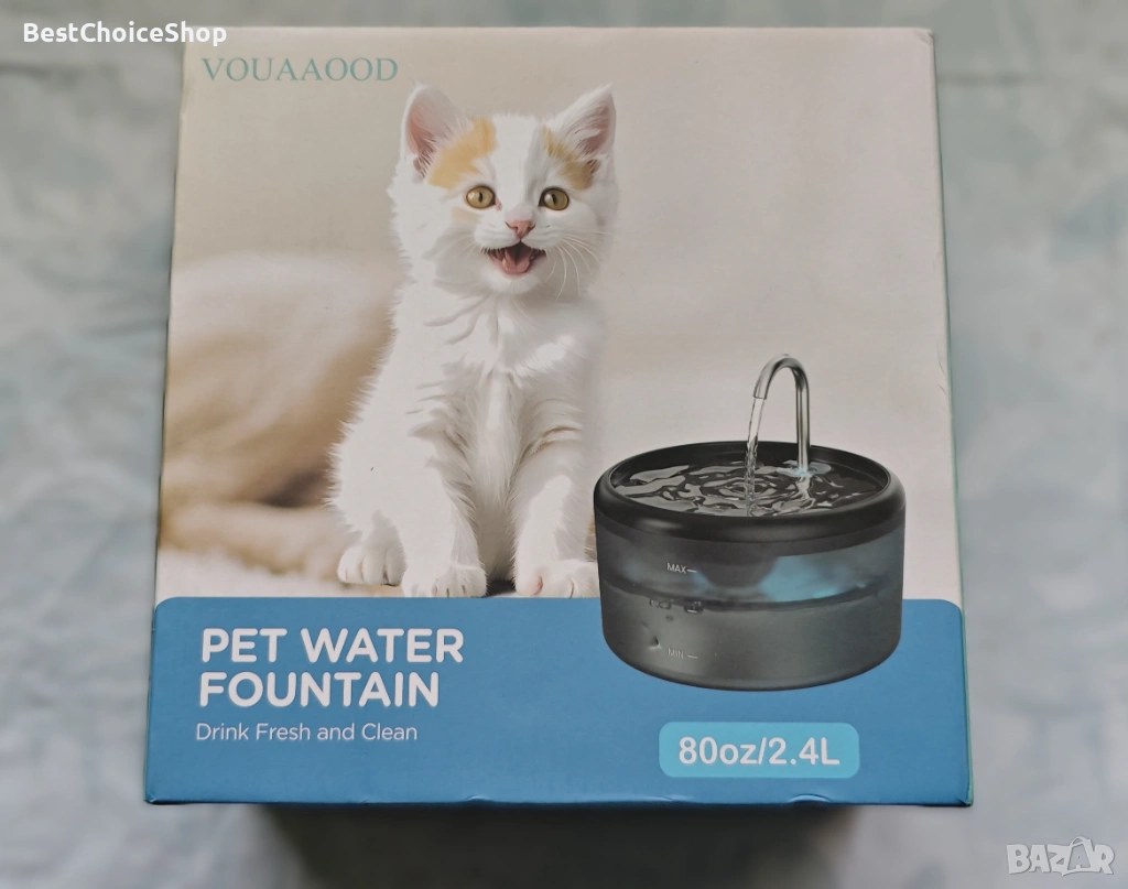 Предлагам фонтан за вода за котки и малки кучета, модел VOUAAOOD, с голям капацитет 2.4 литра (80oz). Осигурява постоянна циркулация на водата, което стимулира животните да пият повече и поддържа водата по-свежа и чиста.