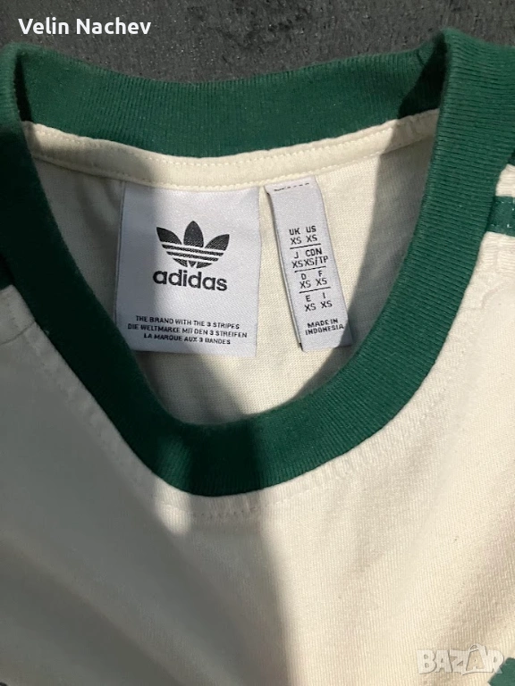 Продавам оригинална тениска adidas Originals в перфектно състояние. Дизайнът е тип "ringer" (с цветни кантове на яката и ръкавите) в класическа комбинация от млечно бяло/екрю и тъмнозелено.