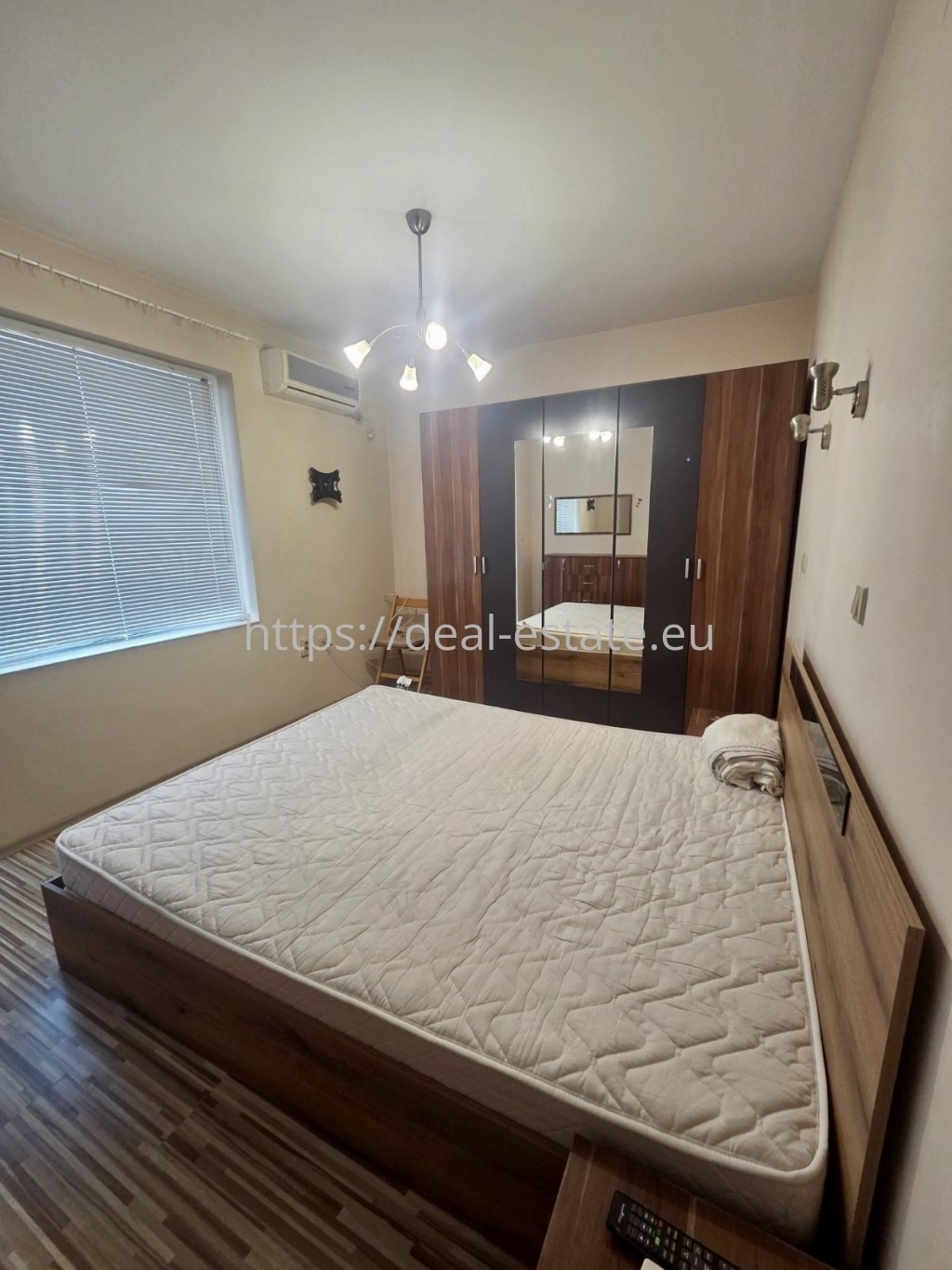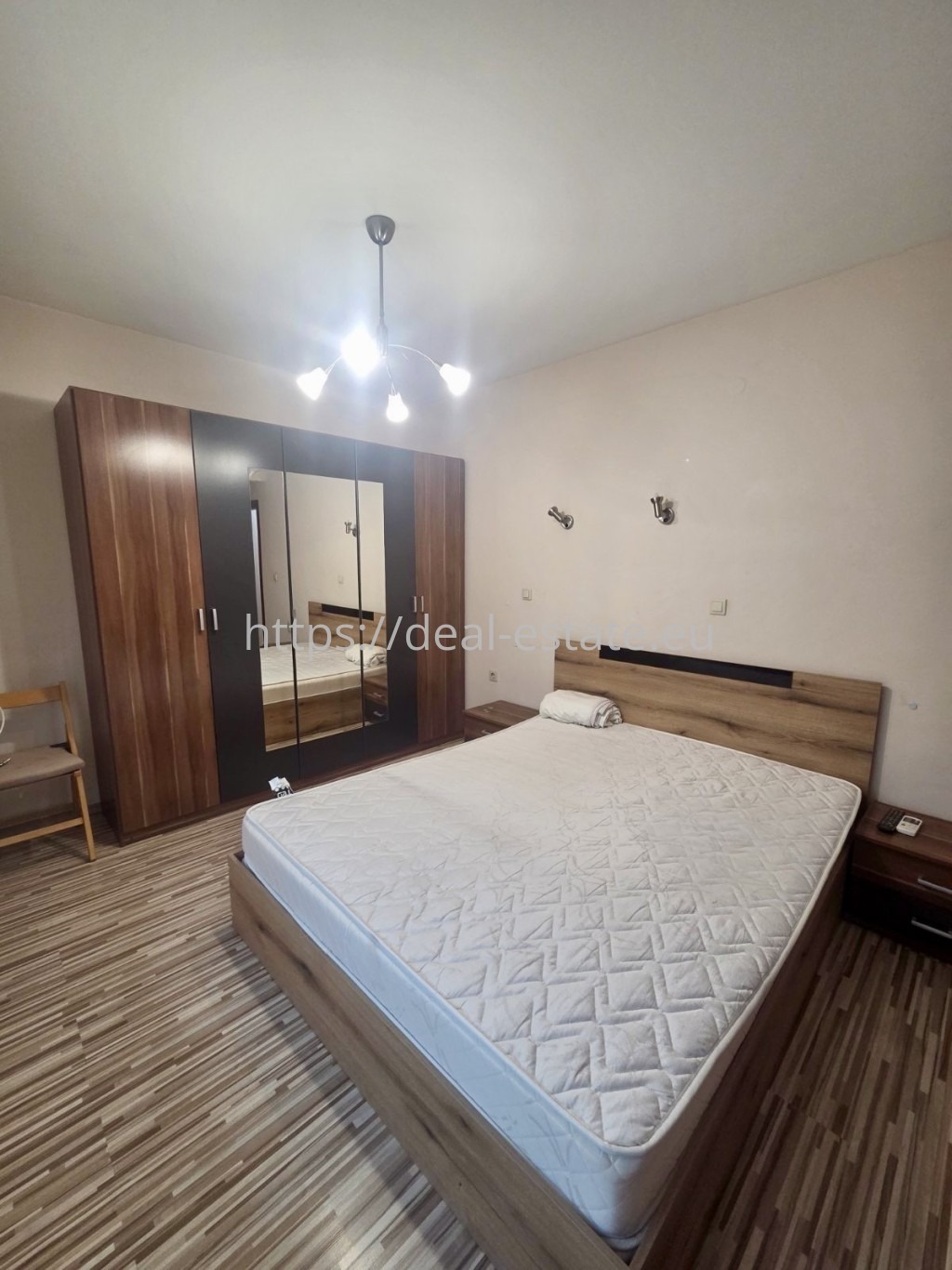 Двустаен апартамент под наем в широк център на гр. Благоевград, в близост до болница Пулс. Жилището е разположено на втори жилищен етаж в сграда ново строителство с контролиран достъп и добре поддържани общи части. Състои се от коридор, всекидневна с кухненски бокс, спалня, баня с тоалетна и тераса. Всекидневната е обзаведена с мека мебел с подходяща маса, трапезна маса, маса с LCD телевизор. Кухнята разполага с печка, хладилник, пералня и микровълнова. Спалнята е обзаведена с комплект спалня с нощни шкафчета, скрин, гардероб. Отоплението/охлаждането на жилището е решено с климатици във всяка стая. Обява 2178.