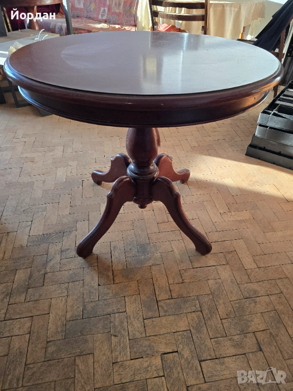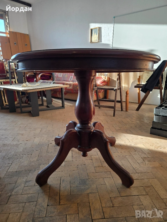 Продавам солидна кръгла дървена трапезна маса, изработена от масивно дърво. Височина 78см и диаметър 90см. Масата има красиви декоративни крака, който й придават стилен вид. Подходяща за всекидневна или трапезария. Има леки драскотини, но са само повърхностни и могат да се оправят с едно лакиране. Има възможност допълнително да се закупят трапезни столове в подобен стил. Намира се в София кв. Медицинска академия.