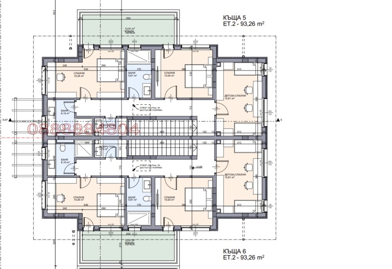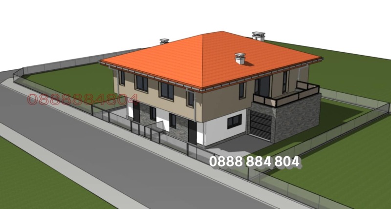 2-ри етаж- стълбище с коридор, 3 спални, 2 бани, голяма тераса и таванско/ складово/ помещение, което не влиза в квадратурата на сградата. Общата площ на къщата е 188.94 кв. м., двор196 - 264,84 кв. м. В квадратурите на къщите няма общи части, както и това, че са обособени дворните места за всяка къща.