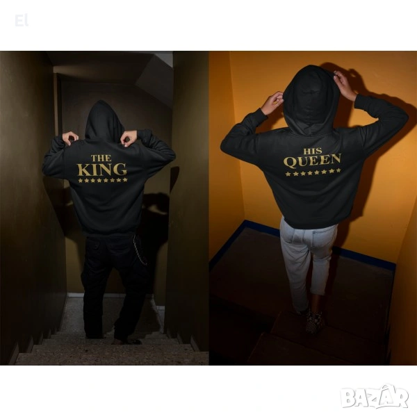 Комплект суичъри за влюбени с щампа The King за мъжкия и His Queen за дамския, отпечатана с висококачествен и издръжлив принт.