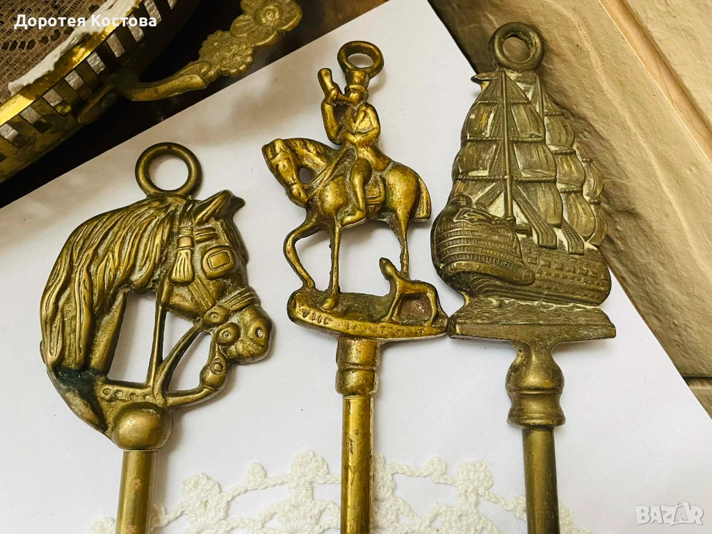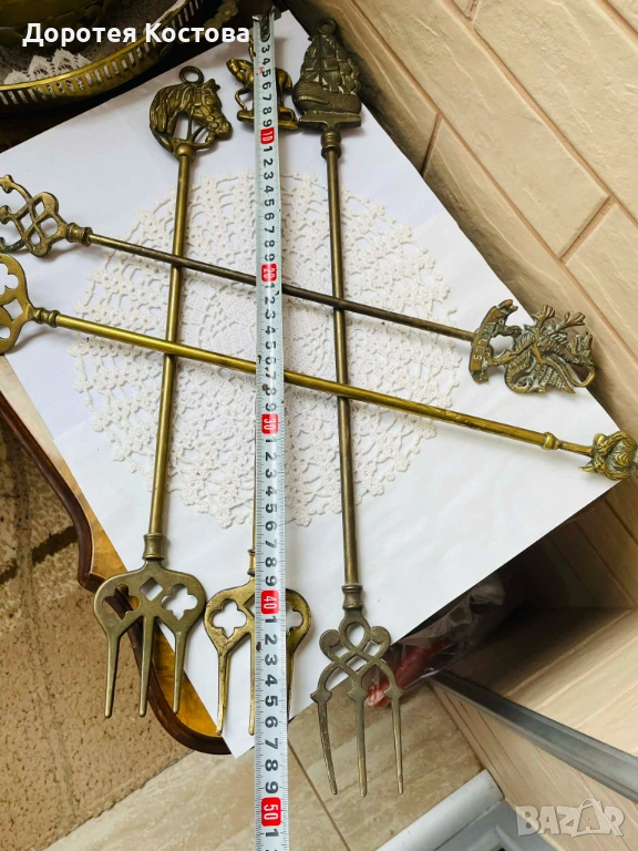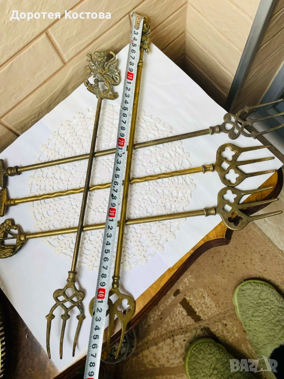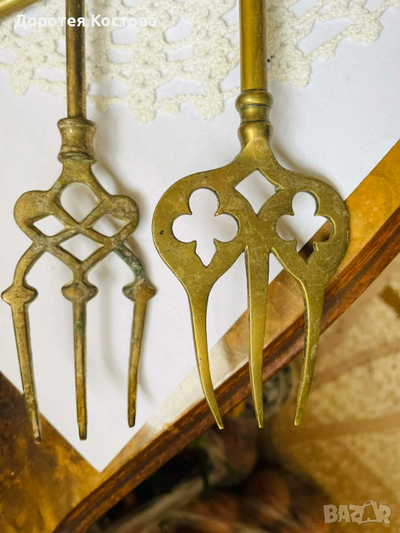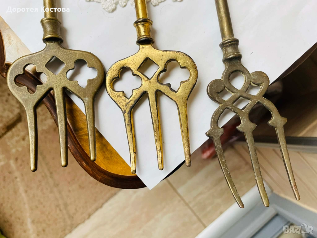 Красиви месингови вилици за камина от Англия, 5 бр различни, масивни и здрави, тежки, не са почистени, размерите са на снимките. Цена за брой - 14 евро / 27.38 лв.