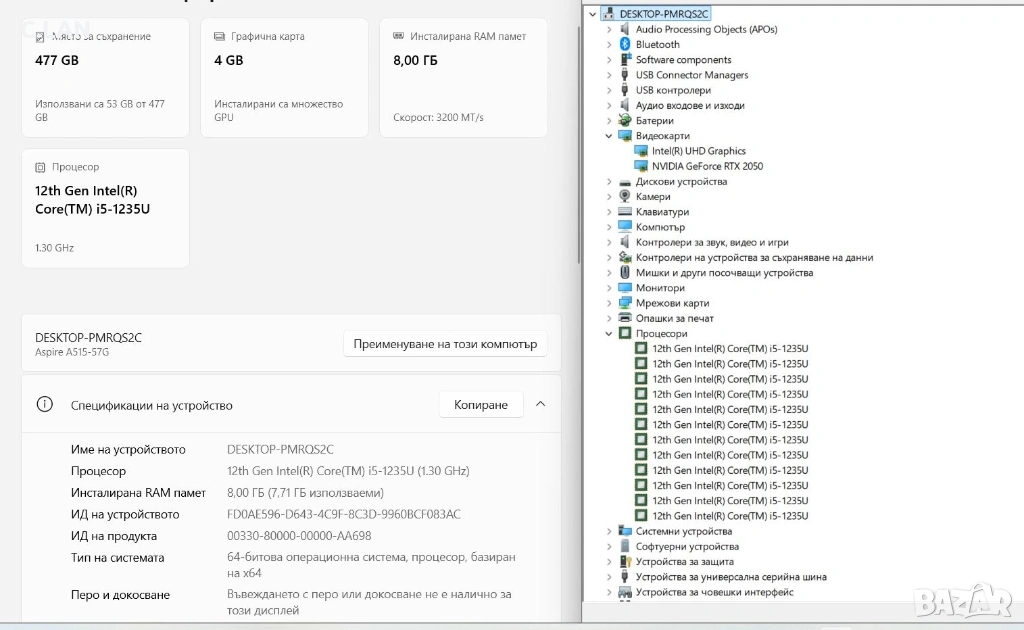 Acer Aspire A515-57G i5 1235U/8GB/512SSD/RTX 2050-4GB/FHD/Подсветка → Обява 53423083