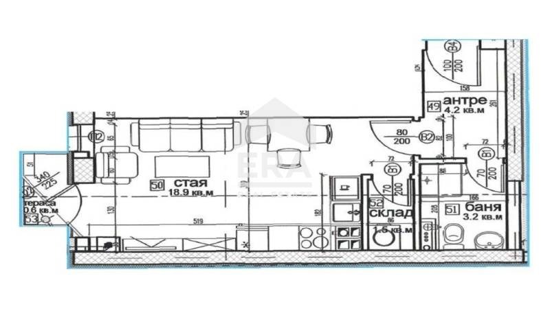 Разпределение: входно антре, стая с кухненски бокс, баня с тоалетна, склад и тераса
