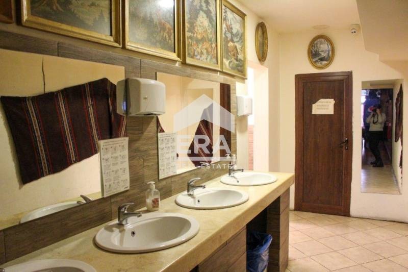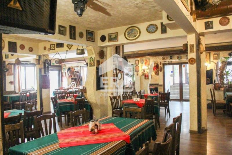 Покритата част се състои от търговска зала с капацитет 300 места , кухня, бар и санитарен възел с 8 бр. тоалетни. Отоплението е чрез климатична система. Предлага се без мебели и оборудване.