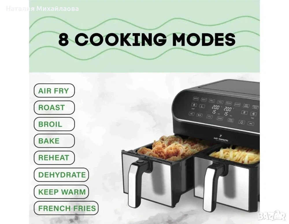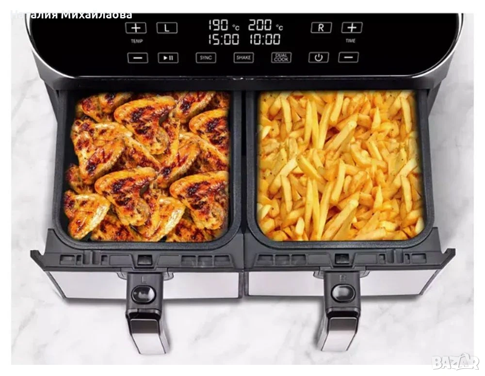 Мощен и практичен Двоен Airfryer XXL 8 литра с 1700W мощност, две независими кошници (2 x 4L), прецизен контрол на температурата от 30°C до 200°C и 8 автоматични програми. Гответе едновременно две различни ястия – по-бързо, по-здравословно и без излишна мазнина.