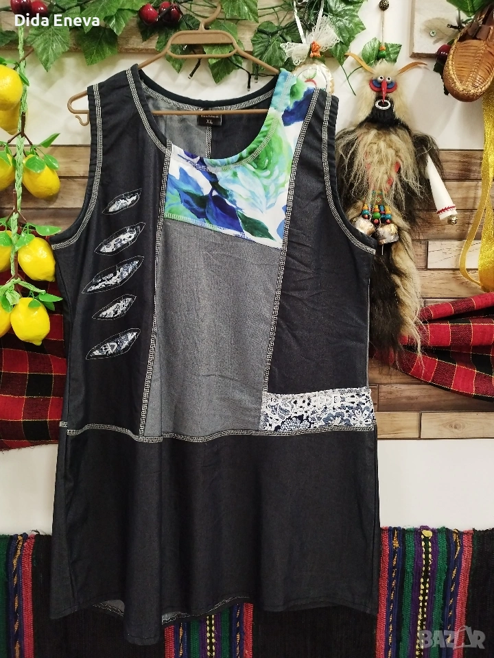 Много приятно съчетани,различни материи. Имитира дънков,но не е.
