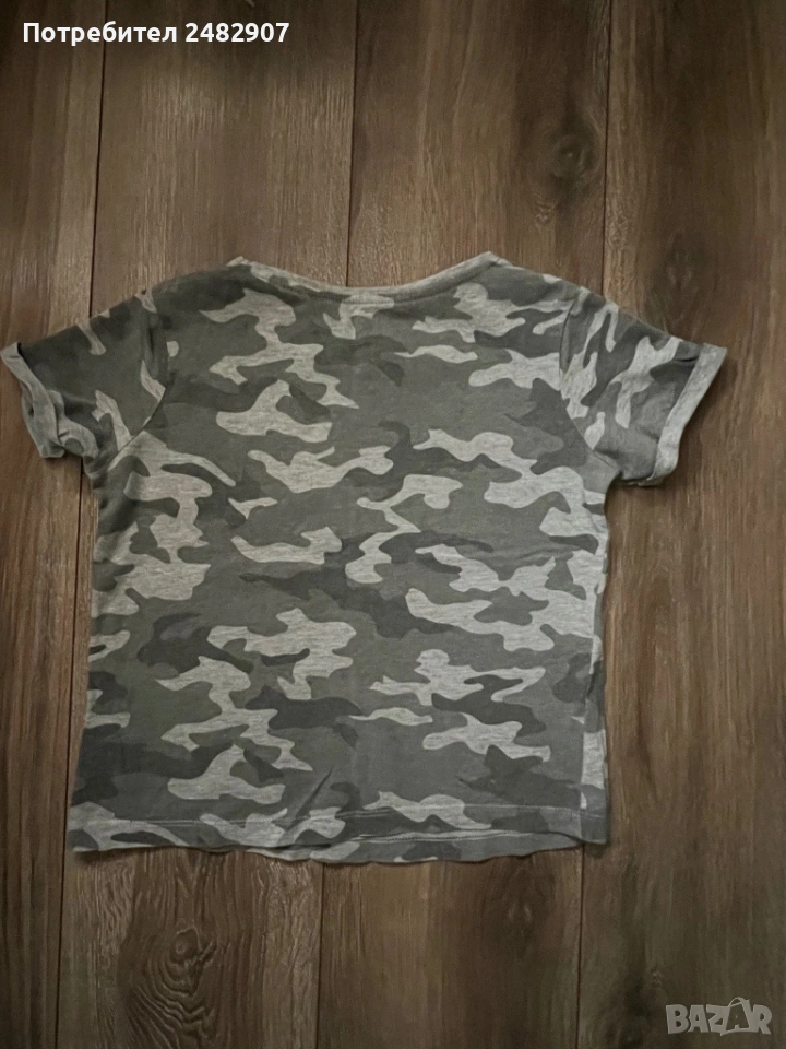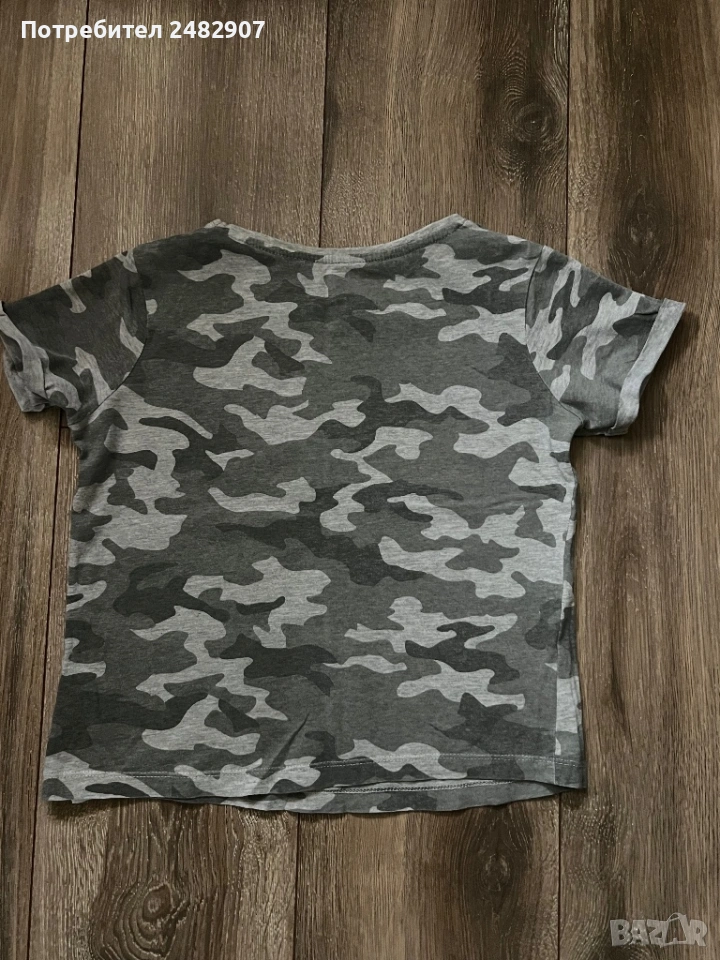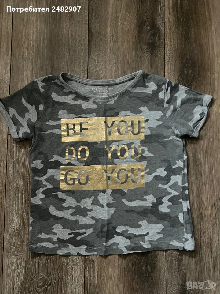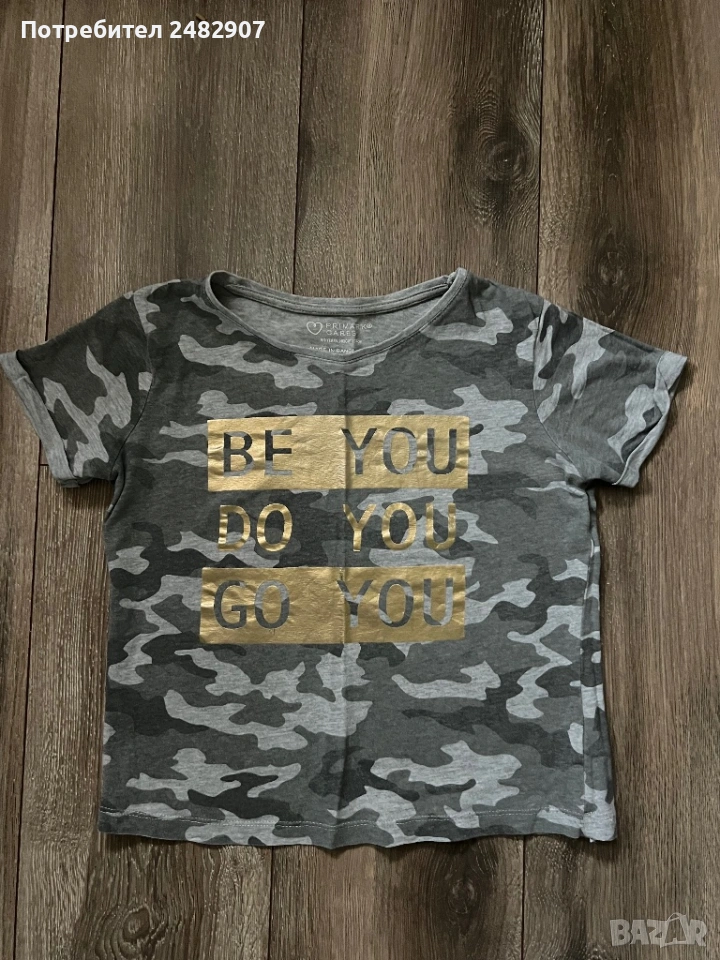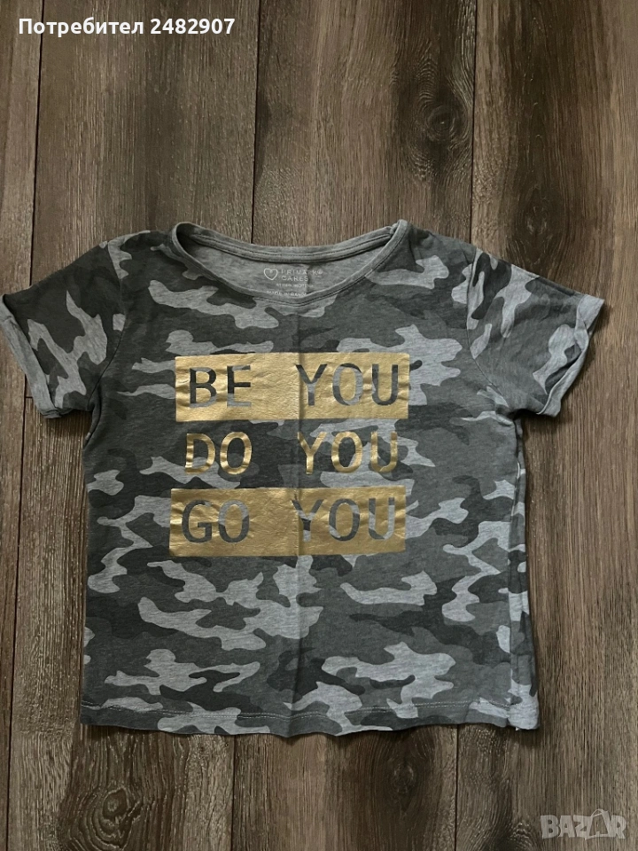 Детска тениска с щампа за момиче за възраст 8-9 години. Съдържа 95 % памук и 5 % вискоза. Ширина в раменете - 33 см, ширина под мишниците - 41 см, ширина в долната част - 42 см, дължина от рамото до долу - 45 см, дължина на ръкава от рамото - 12 см, ширина на ръкава в долната част - 12 см. Много запазена, почти не е изплзвана, без забележки.