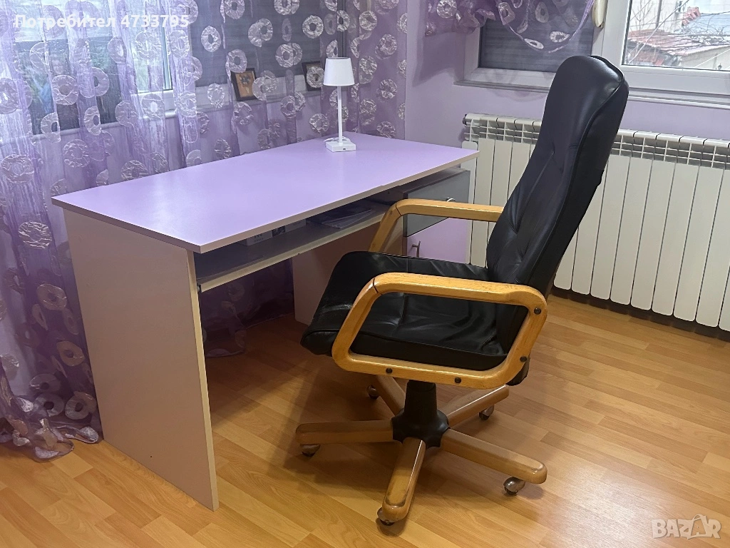 Бюрото има шкаф с разделител,чекмедже и поставка за клавиатура.