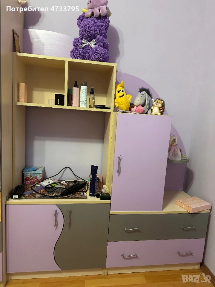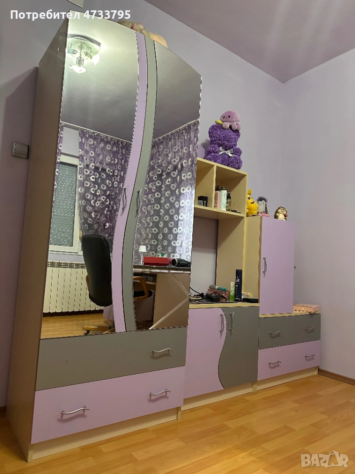 Мебелите са изработени от висококачествено пдч, в изключително запазено състояние,правени са по поръчка.Огледалата също са добавени по поръчка.На снимката няма дръжка,но просто не е сложена,налична си е и няма никакъв проблем с нея,просто трябва да се хване.Секцията има място за закачалки,чекмеджета,рафтове за книги и други неща и шкаф.