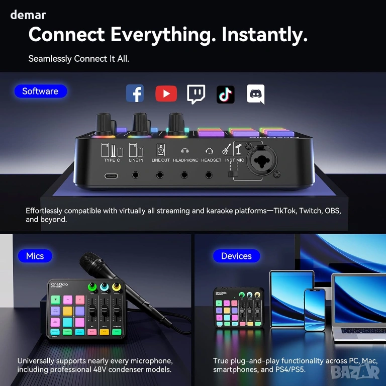 OneOdio Solocaster Геймърски аудио миксер - 5-канален интерфейс