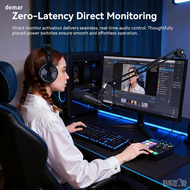 Проектиран за стрийминг и игри, този компактен аудио миксер осигурява висококачествен звук с професионален предусилвател, 48V фантомно захранване, прецизен контрол на усилването и намаляване на шума с едно докосване за ясни, готови за излъчване вокали. Той предлага множество гласови ефекти в реално време, персонализируеми звукови подложки и обработка на вокали, като реверберация, странична верига и автоматично заглушаване, за да подобри съдържанието на живо. Интуитивният интерфейс поддържа Bluetooth аудио миксиране, незабавно заглушаване, директен мониторинг, loopback и премахване на вокали за караоке, докато динамичното RGB осветление с множество режими добавя визуален щрих към всяка стрийминг система.