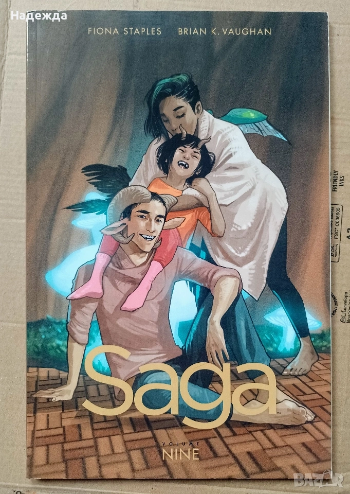 Saga (Сага) е научно-фантастична/фентъзи драма поредица от комикси за възрастни, написана от Brian K. Vaughan, илюстрирана от Fiona Staples и публикувана от Image Comics. Тази книга е том девети от поредицата. В перфектно състояние е (случайно купих дубликат и затова продавам втория). Език: английски.
