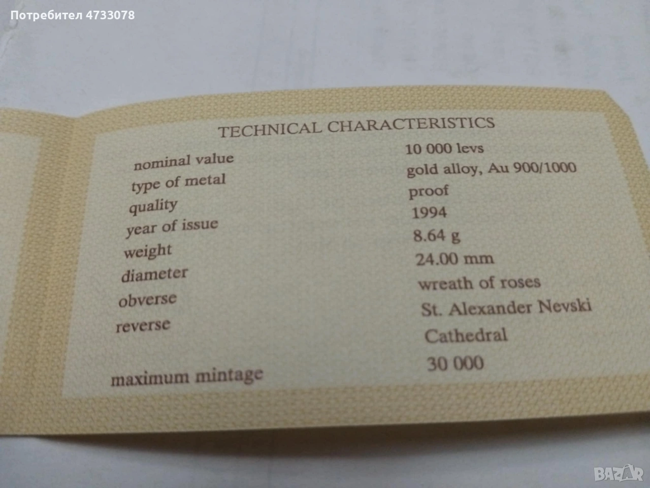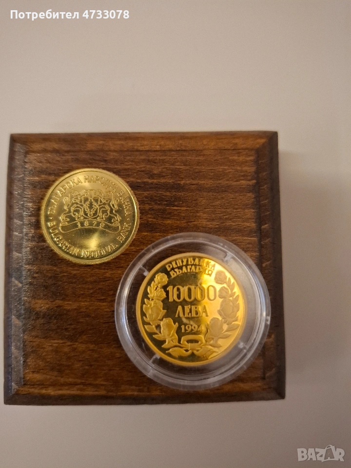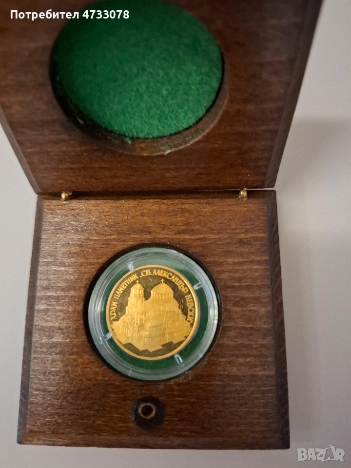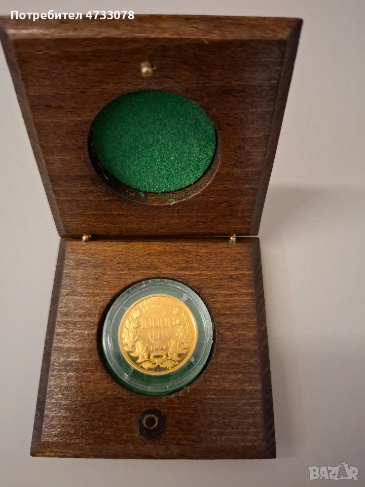 Златна монета 10 000 ЛЕВА – 1994 г. Храм-паметник „Св. Александър Невски“ |. Продавам оригинална българска златна паметна монета. Номинал: 10 000 лева Година: 1994 Материал: злато 900/1000 Тегло: 8.64 г (≈ 7.78 г чисто злато) Състояние: отлично / Proof Съхранение: в капсула и оригинална дървена кутия Сертификат: ДА (оригинален) Монетата е в много запазена колекционерско състояние, без следи от употреба. Подходяща както за инвестиция, така и за нумизматична колекция. Лично предаване за гр. София и възможност за проверка при златар.