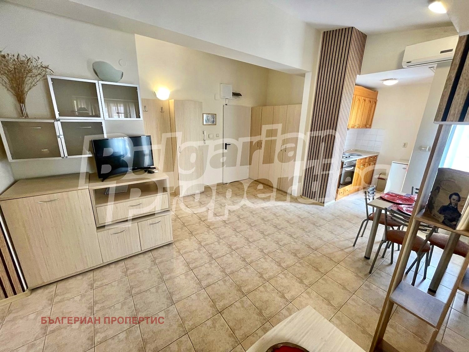 Интериорът е решен с артистични акценти и внимание към детайла, което придава характер и уют на пространството. От апартамента се разкрива приятна панорама към басейна на комплекса, както и красива гледка към морето, създаваща усещане за простор, светлина и релакс.
