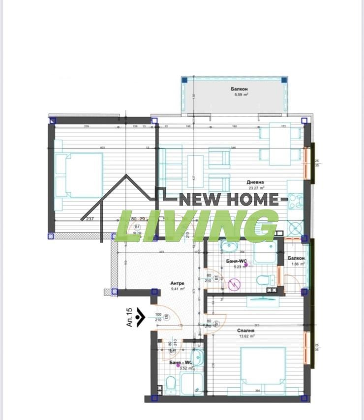 Жилището е със следното разпределение: хол с трапезария и кухненски кът, две просторни спални, голямо входно антре, две бани с тоалетни, склад на етажа и два балкона.