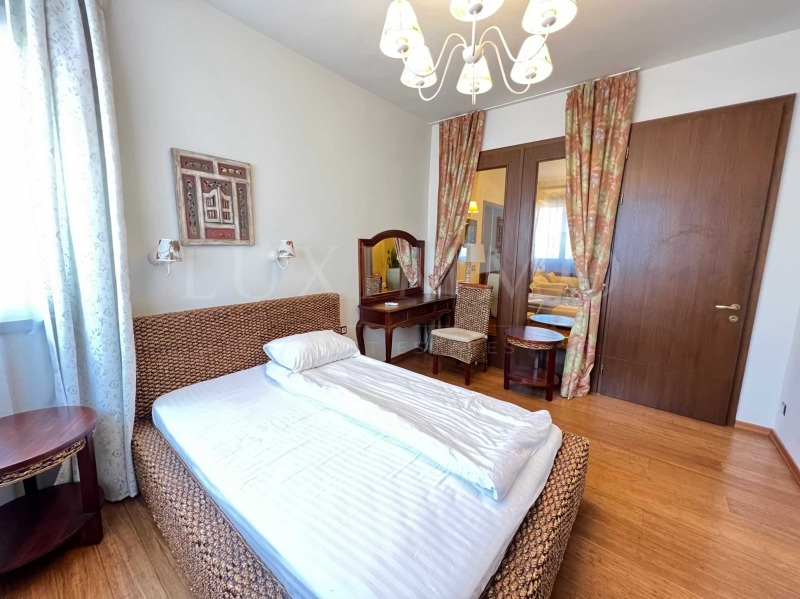 родителска спалня с панорамни прозорци към дневната, собствена баня с вана и балкон;