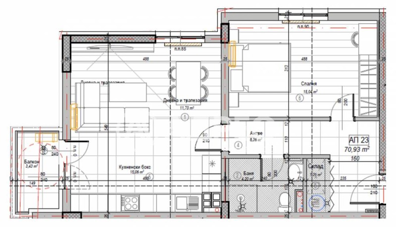 Прекрасен двустаен апартамент на трети етаж на кота +8,55м. Жилището е с РЗП-81,21м2 и ЗП-70,93м2. Апартаментът се състои от: антре, голяма дневна с кухненски бокс и трапезария-26,57м2, голяма спалня-15,04м2, баня с тоалетна-4,20м2, склад и балкон-3,43м2. Налични ПМ и гаражи. Цените са крайни с включен ДДС. Без комисион.