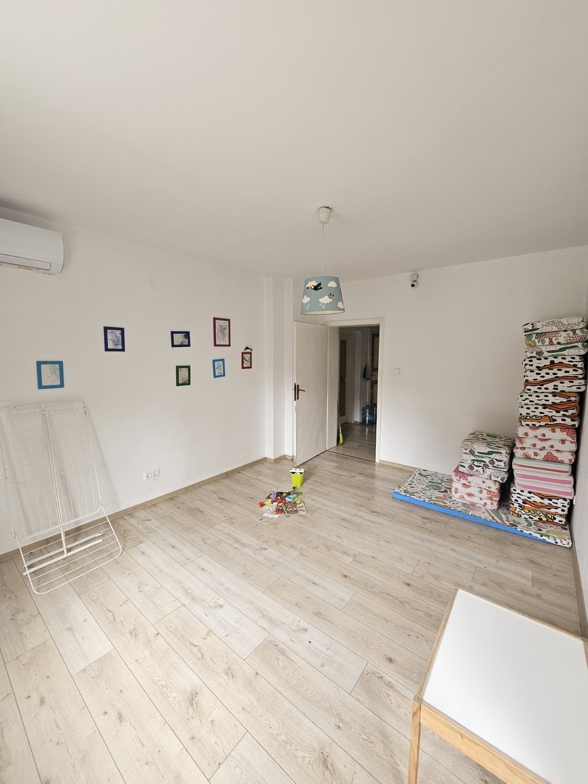 Разпределнение: коридор, кухненски бокс с трапезария, три помещения, две от които са свързани.Три паркоместа в двора. Отопление - климатици. Имот, подходящ за живеене, за офис, за лекарски кабинети.