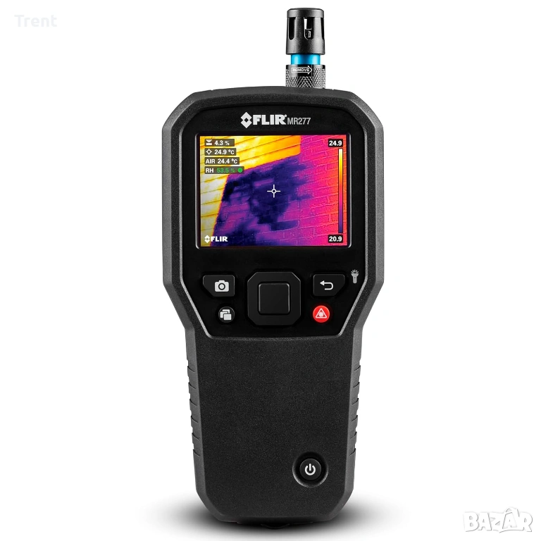 Този FLIR влагомер е универсален и прецизен инструмент, предназначен за бързо идентифициране на проблеми с влагата и ограждащите конструкции на сградата. Той комбинира инфрачервено насочвано измерване (IGM™) с FLIR многоспектрално динамично изображение (MSX®), за да осигури точни показания. Интегрираният безщифтов сензор за влага предлага неинвазивни показания, които могат да бъдат потвърдени с външната щифтова сонда. С функции като вграден хигрометър и сменяем на място сензор за температура/относителна влажност, отстраняването на неизправности се ускорява. Функцията meterlink® позволява лесно свързване с мобилни устройства за качване и отчитане на данни.