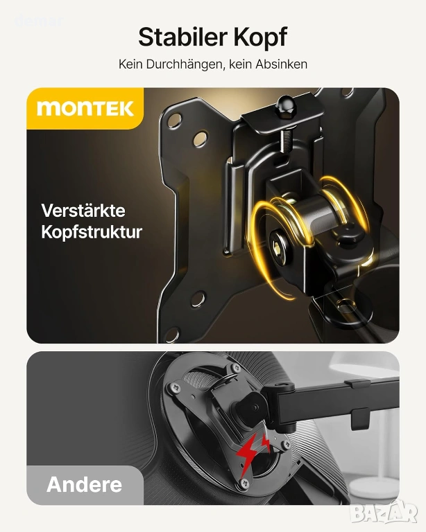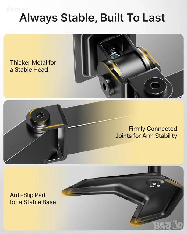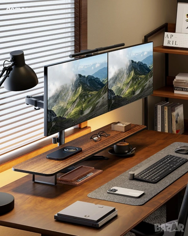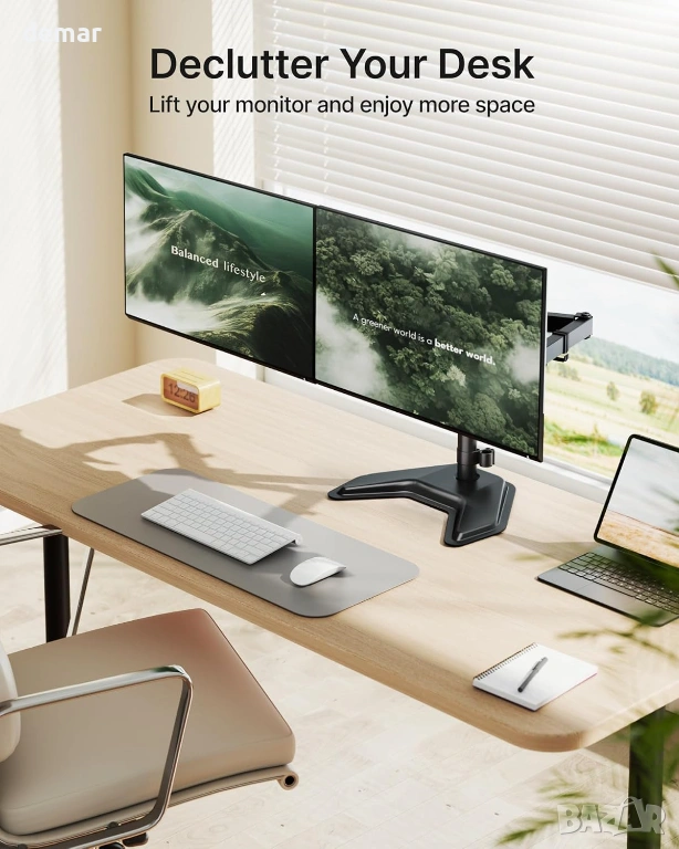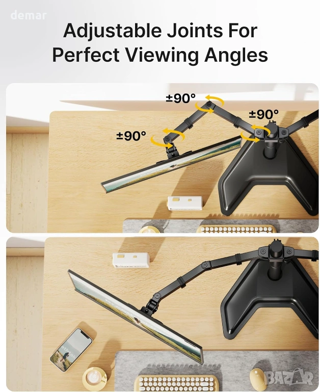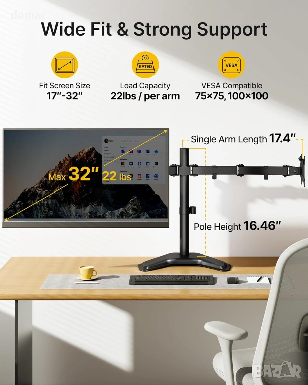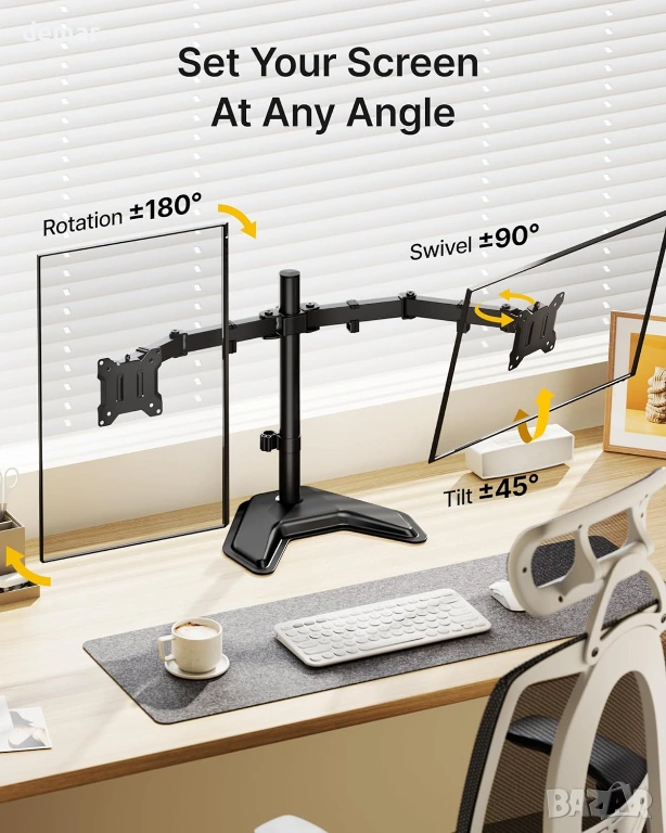 Здрава стоманена конструкция с подсилени съединения, удебелени горни плочи, противоплъзгащи подложки за основата и стабилна, свободно стояща V-образна основа осигуряват надеждна и безклатеща се опора без пробиване или скоби, което я прави подходяща за деликатни бюра. Стойката поддържа повечето 17–32-инчови монитори със съвместимост с VESA 75×75 и 100×100, като издържа до 10 кг на рамо. Напълно регулируемите рамена позволяват плавно удължаване, прибиране, завъртане, накланяне и завъртане, което позволява лесно превключване между портретна и пейзажна ориентация и прецизно позициониране за удобни, ергономични конфигурации с множество екрани.