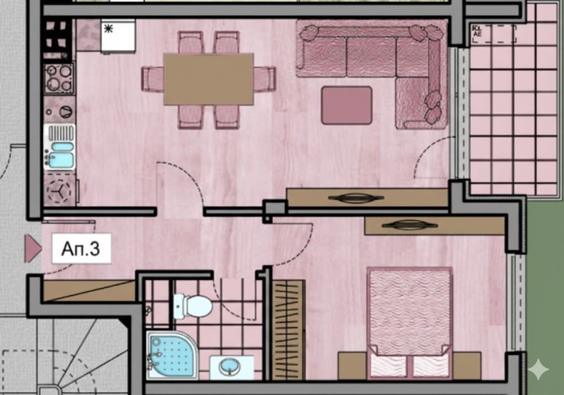 Жилището се състои от:Коридор, просторна всекидневна с кухненска част, спалня, баня+тоалет, тераса.