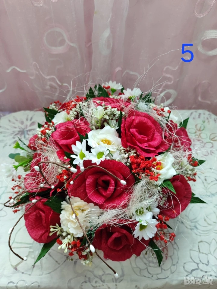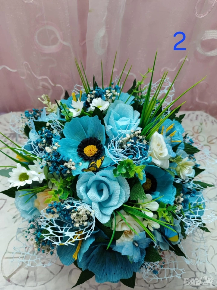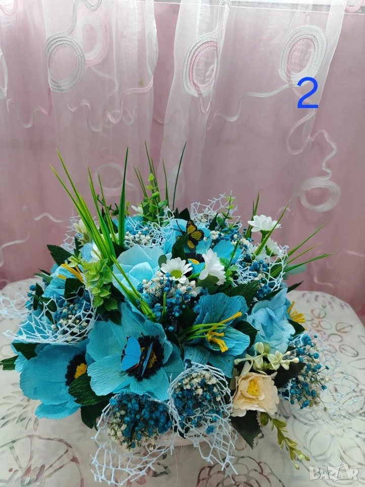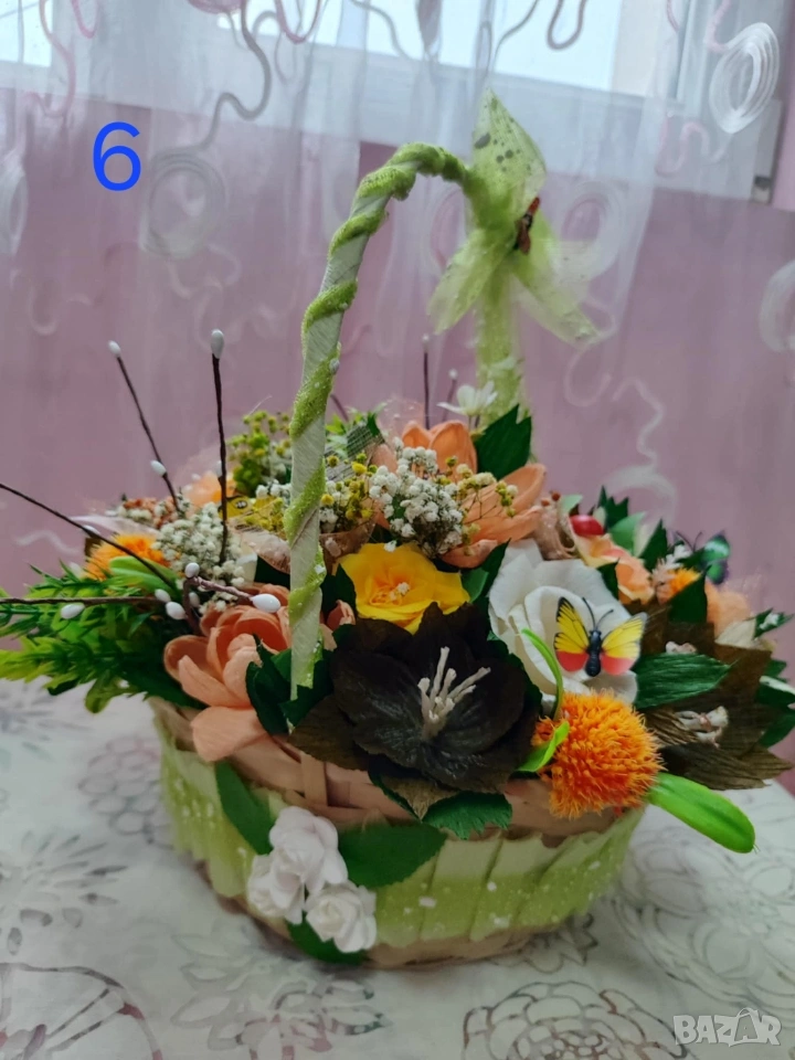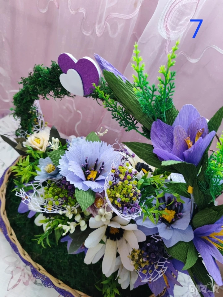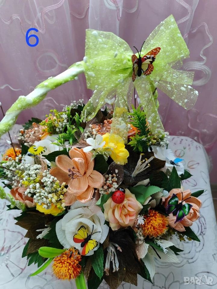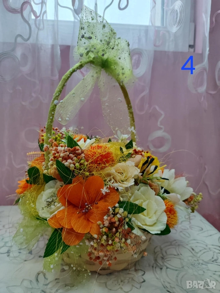 Предлагам изключително красиви и стилни кошници с изкуствени цветя, изработени от висококачествена креп хартия и подредени в ръчно плетени кошници.