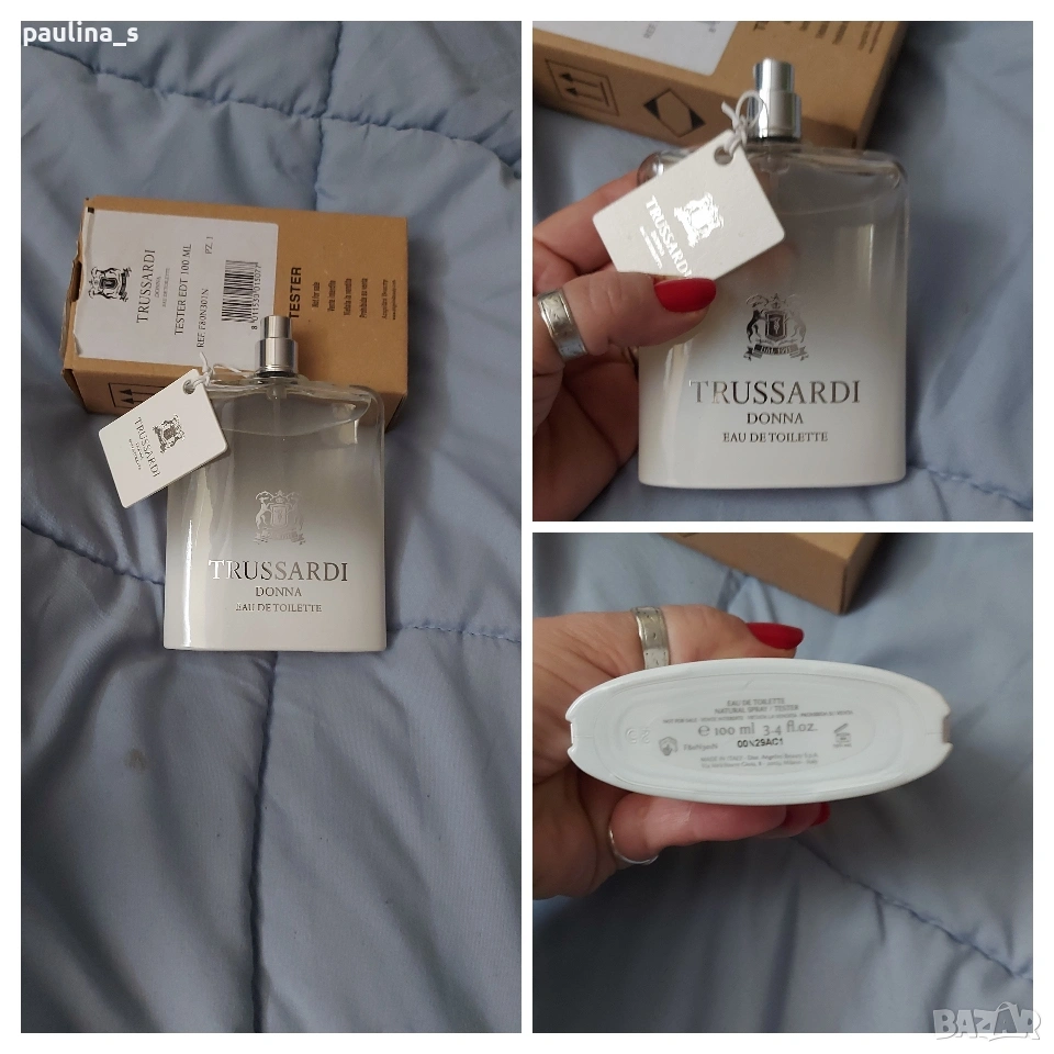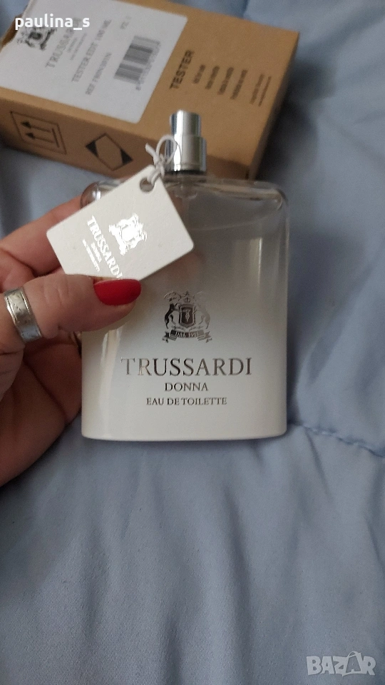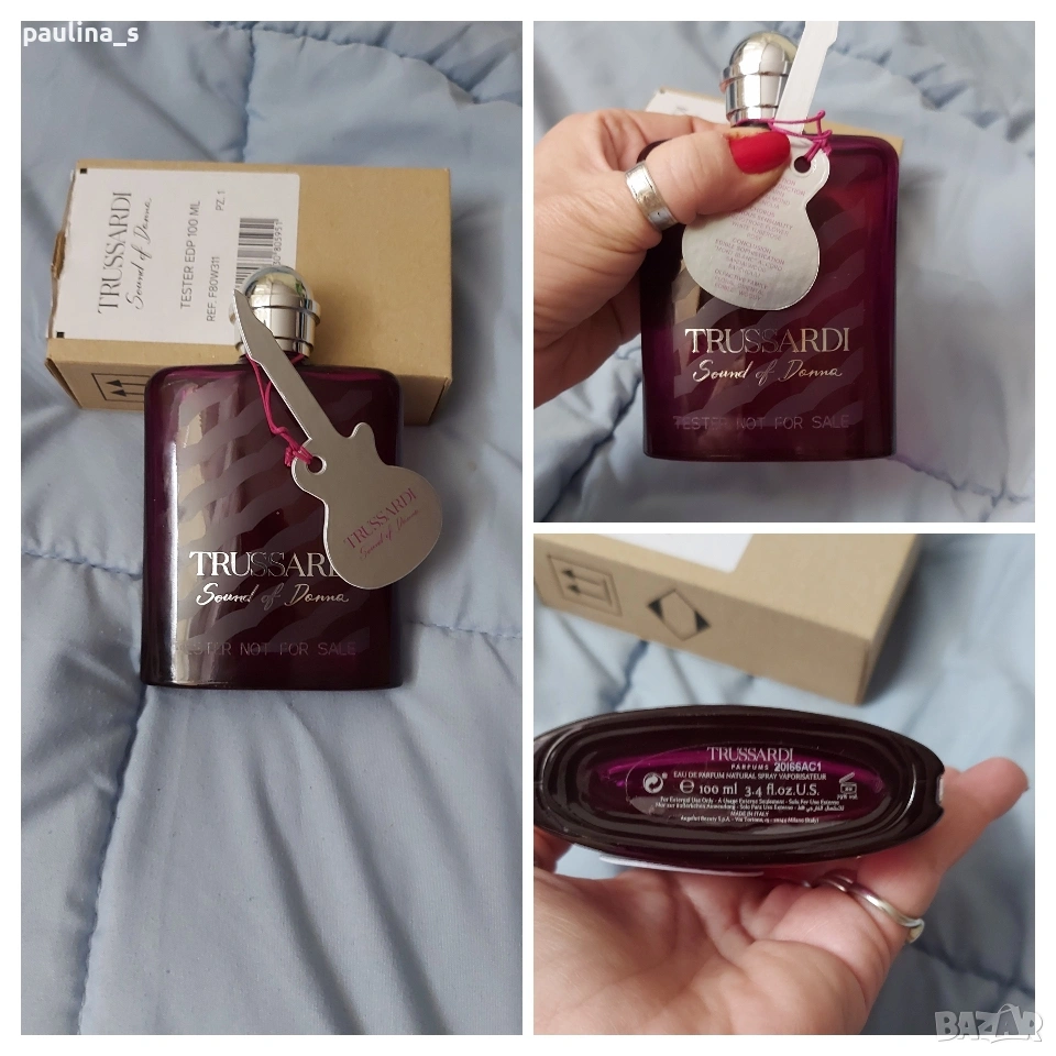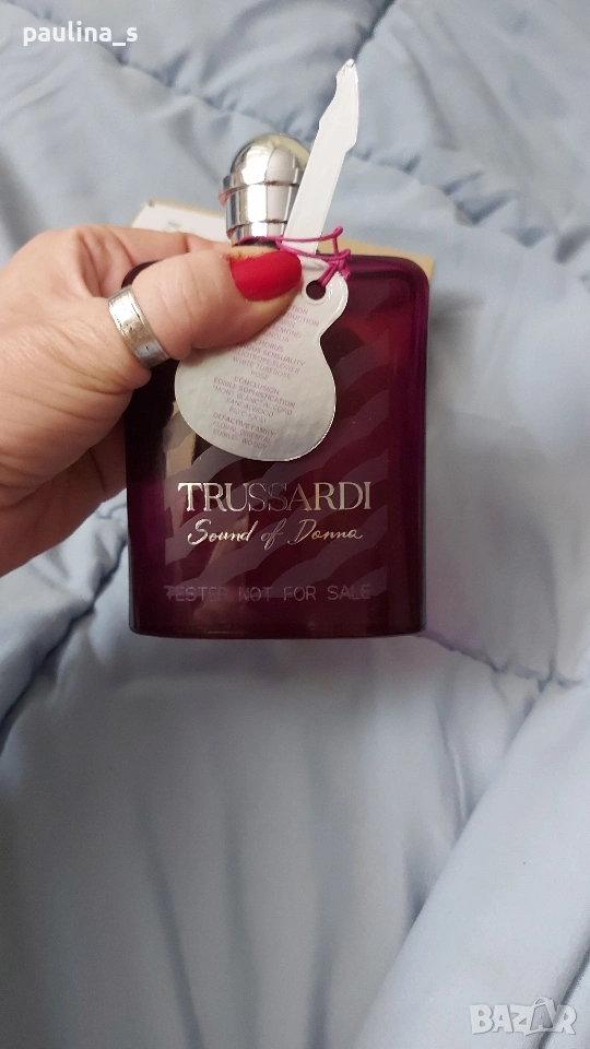 1️⃣. Дамски парфюм "Sound of Donna" by Trussardi / 100ml EDP, в тестерна опаковка. Цената е крайна, без пазарлъци 50 евро. Дамски дизайнерски парфюм с доказано качество в годините. Част от личната ми колекция, който никога не е ползван. В тестерна опаковка, с капачка. Съхраняван е на тъмно и в кутията. Подходящ е за подарък или повод. Информацията и ароматната пирамида са от Фрагрантика.