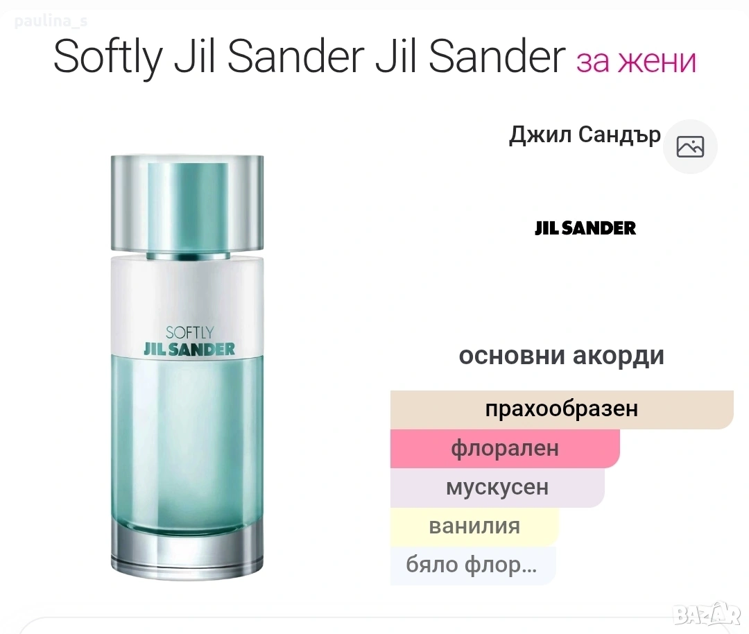 2️⃣. Дамски парфюм "Softly" by Jill Sander / 100ml EDT. Цената е крайна, без пазарлъци 45 евро. Дамски парфюм с доказано качество в годините, част от личната ми колекция, който никога няма да ползвам, в тестерна опаковка с капачка, съхраняван е на тъмно и в кутията. Подходящ е за подарък или повод. Творение на Наталия Лорсън, признат парфюмен гений. Информацията и ароматната пирамида са от Фрагрантика.