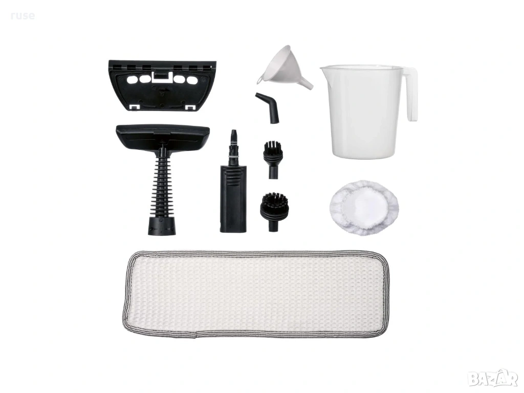 Комплектът включва: Парочистачка, четка за под, накрайник за цепнатини, голяма кръгла четка, малка кръгла четка, накрайник за тапицерия, приставка за прозорци, 2x удължителни тръби, адаптер за четка за под и накрайник за цепнатини, кърпа за почистване за четка за под, малка кърпа за почистване, мерителна чаша, фуния