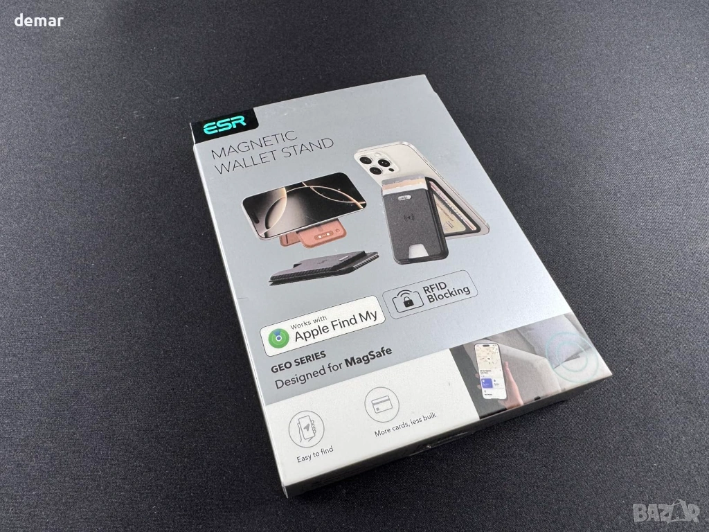 Портфейлът ESR Geo MagSafe с пълната поддръжка на Find My, сертифицирана от Apple, позволява проследяване в реално време, звукови сигнали и известия за „Left Behind“, предлагайки функционалност, подобна на AirTag. Той разполага с изключително силно магнитно задържане, за да държи картите сигурно прикрепени, като същевременно поддържа тънък профил, който все пак побира до пет карти, включително прозрачен слот за лична карта с бърз достъп. Вградената RFID защита помага за предотвратяване на неоторизирано сканиране и дигитална кражба. Портфейлът е презареждаем, осигурява дълъг живот на батерията с едно зареждане и поддържа стотици цикли на зареждане, и е проектиран за употреба с MagSafe-съвместими модели iPhone и магнитни калъфи, с изключение на мини версиите.