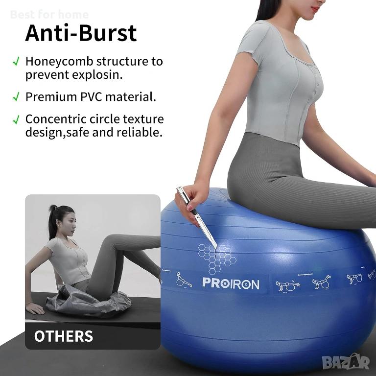 【Противопускаща】 Нашите фитнес топки са изработени от висококачествен PVC материал и имат противопукаща структура тип „пчелна пита“. Системата против спукване означава, че топката за упражнения PROIRON се изпуска бавно, вместо да се пръска, когато бъде пробита от остри предмети.