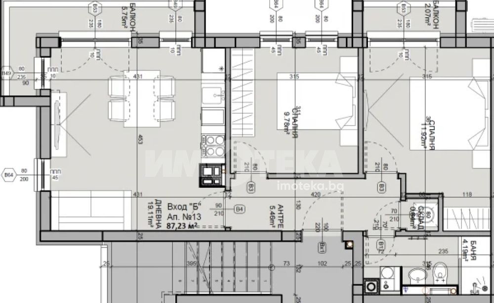 ТРИСТАЕН АПАРТАМЕНТ с площ 87,23м2 /ЗП 71,09м2. Изложение запад/юг.