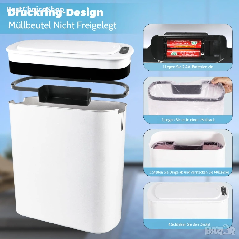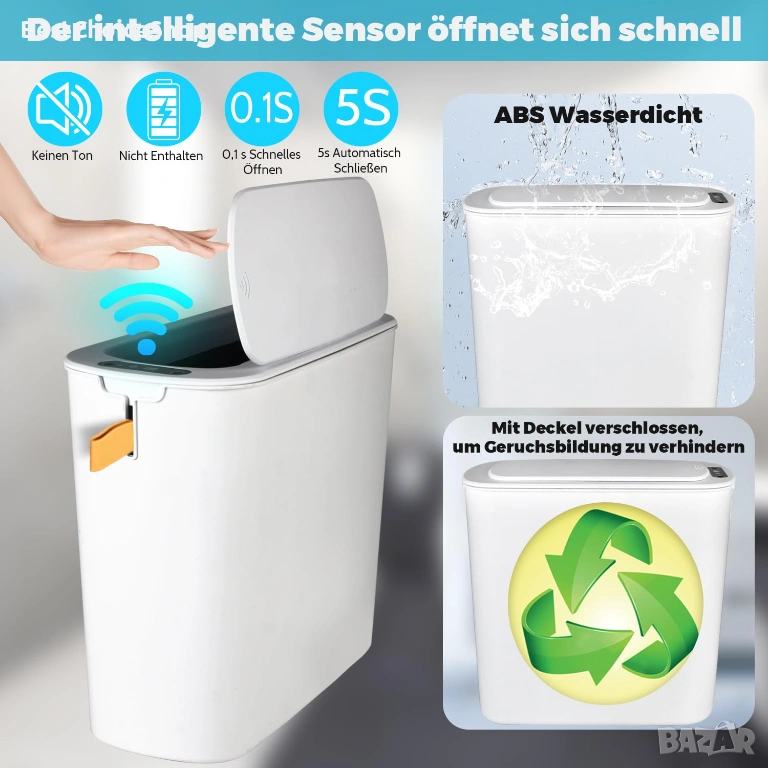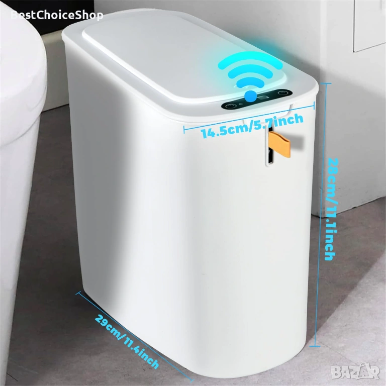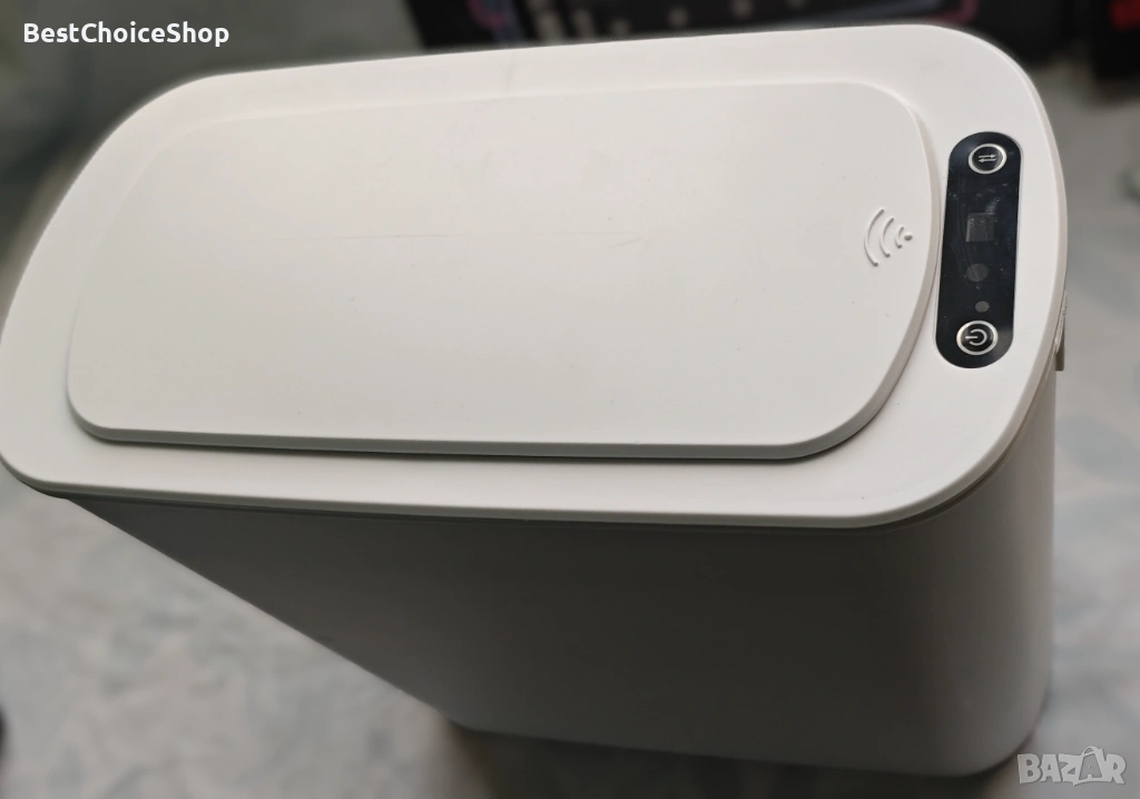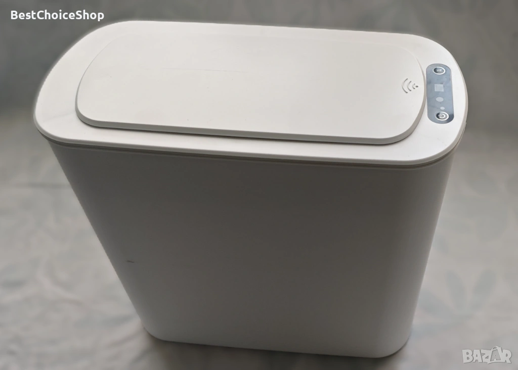 Модерен кош за смет с инфрачервен сензор за безконтактно отваряне. Практично и хигиенично решение за баня, кухня или офис.