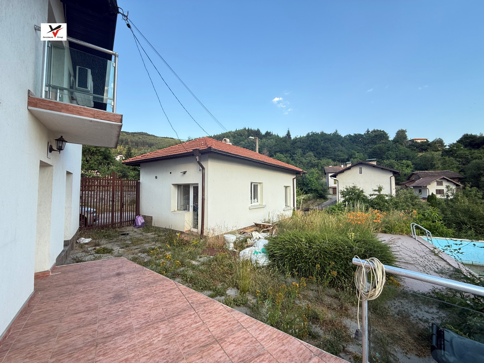 Дворът е с площ от 480 кв.м. като в него има и построена малка къщичка, която може да ползвате за къща за гости или склад и паркомясто. Имотът разполага и с басейн.