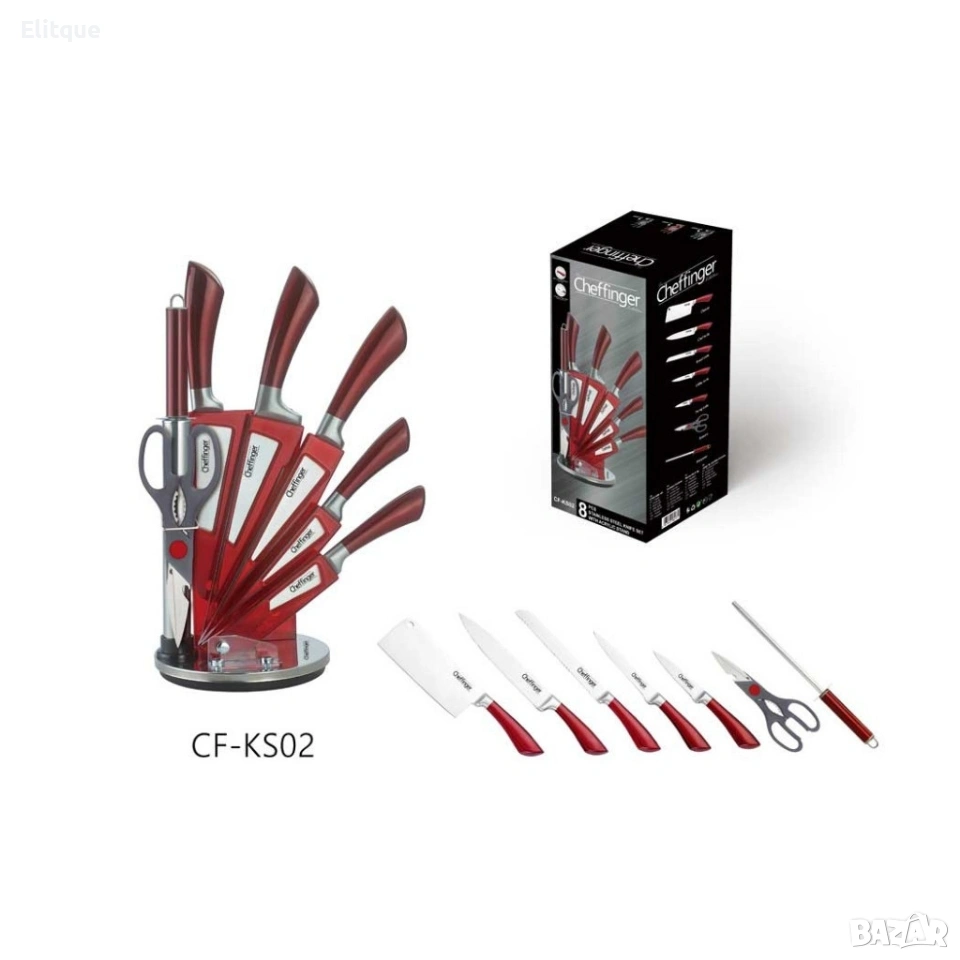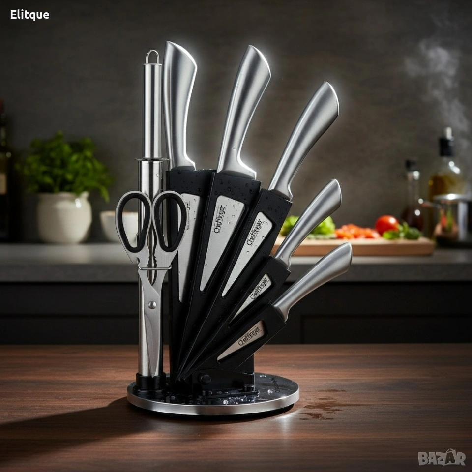Комплект ножове 8 части със стойка Cheffinger – неръждаема стомана, въртяща се акрилна поставка 360°