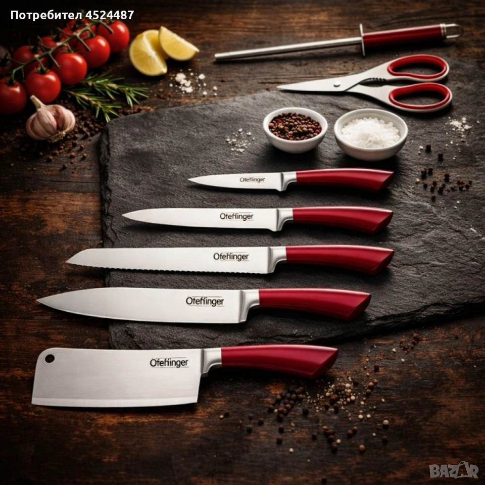 Тип продукт: Комплект ножове 8 части - 5 ножа, ножица, точило и стойка; Материал: неръждаема стомана (ножове), акрил (стойка); Размери: Точилка (масат): 19.10 см; Ножица: 18.40 см; Нож за белене: 8.90 см; Универсален нож: 12.70 см; Нож за хляб: 20.30 см; Готварски нож: 20.30 см; Сатър: 16.50 см; Температурна устойчивост: подходящи за стандартна кухненска среда; Поддръжка / почистване: ръчно измиване, лесно почистване; Допълнителни функции: 360° въртяща се основа.