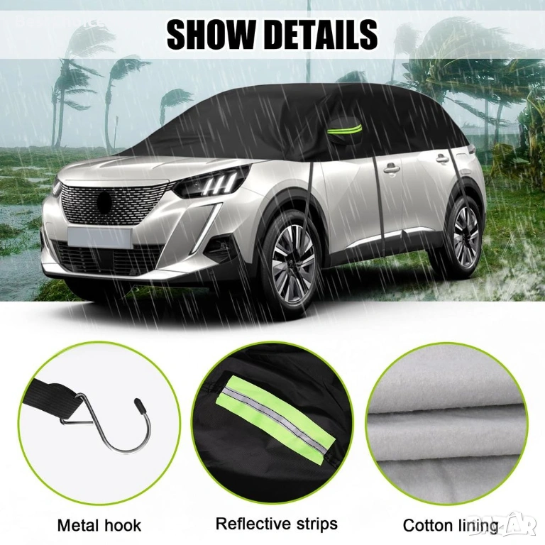 Светлоотразителните ленти увеличават видимостта на пътя, а осем еластични ленти, комбинирани с метални кукички, осигуряват сигурно прилягане дори при силен вятър. Допълнителните възглавнички за ушите на огледалата предпазват от надраскване, а специалният дизайн на сенника се адаптира перфектно към формата на превозното средство.