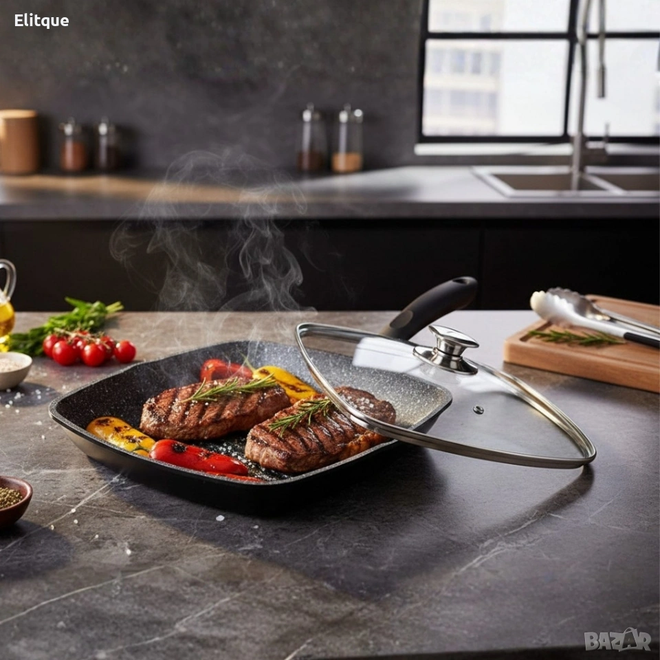 Тип продукт: грил тиган с капак; Диаметър / размер: 28 × 28 см; Материал: метален корпус с мраморно незалепващо покритие; Капак: стъклен, термоустойчив; Дръжка: ергономична със меко, противоплъзгащо покритие; Тип котлони: подходящ за индукционни, газови и електрически котлони; Дъно: стабилно, за равномерно разпределение на топлината; Поддръжка / почистване: лесно почистване, не задържа миризми; Безопасност: подходящ за контакт с храна.
