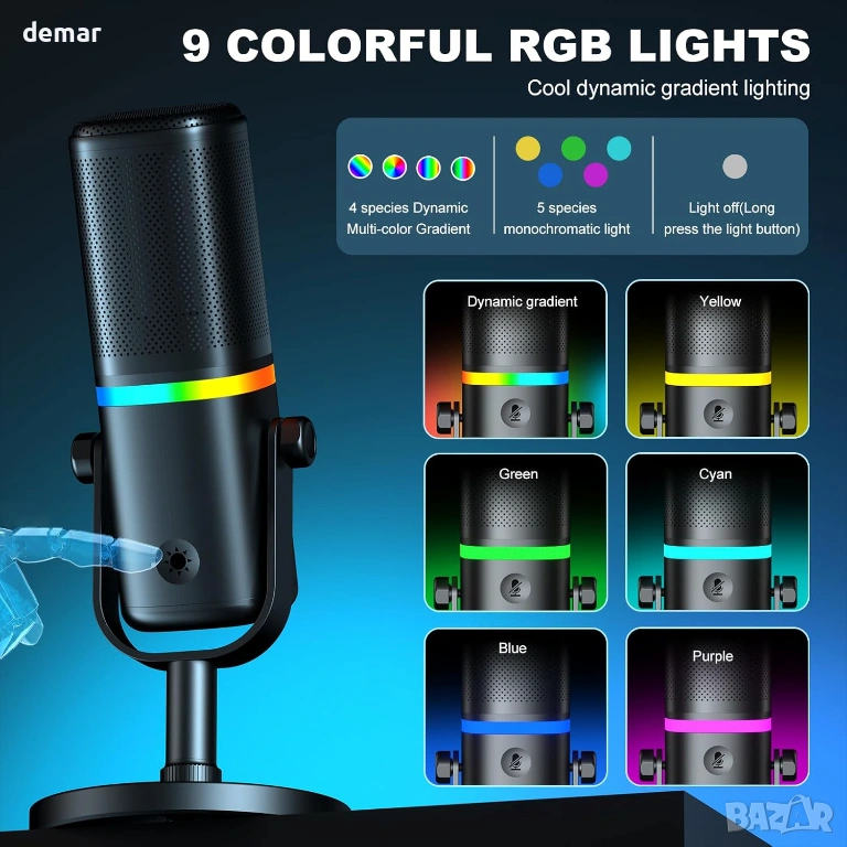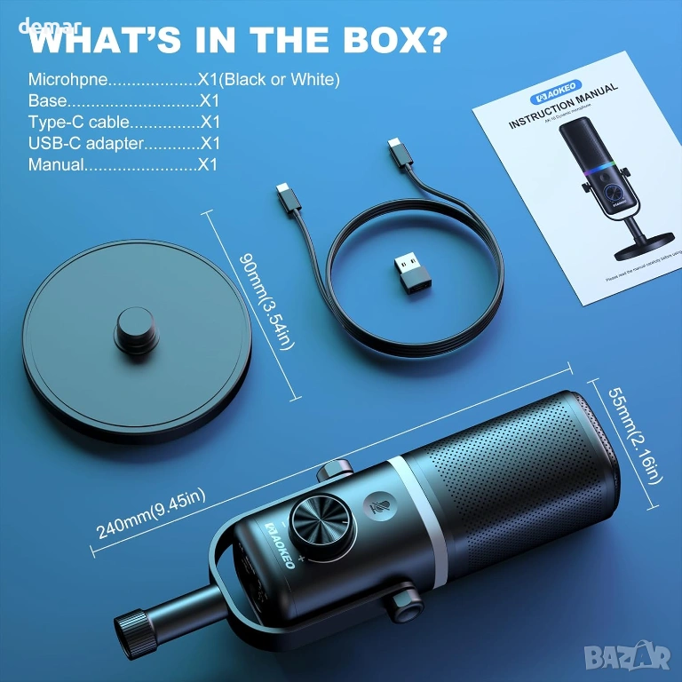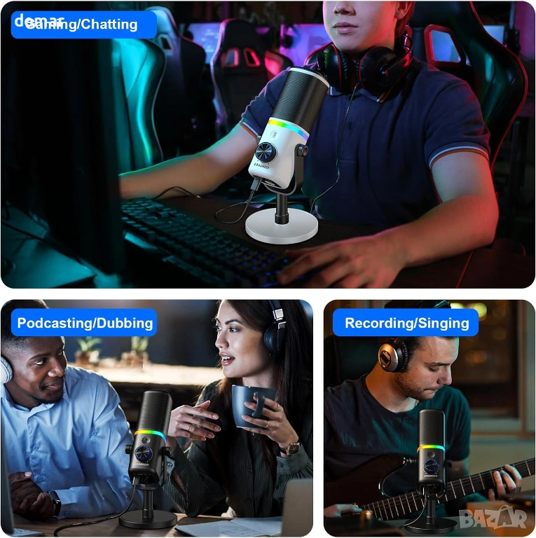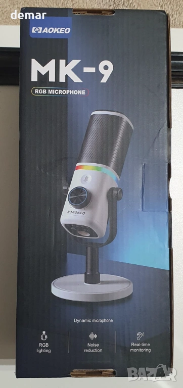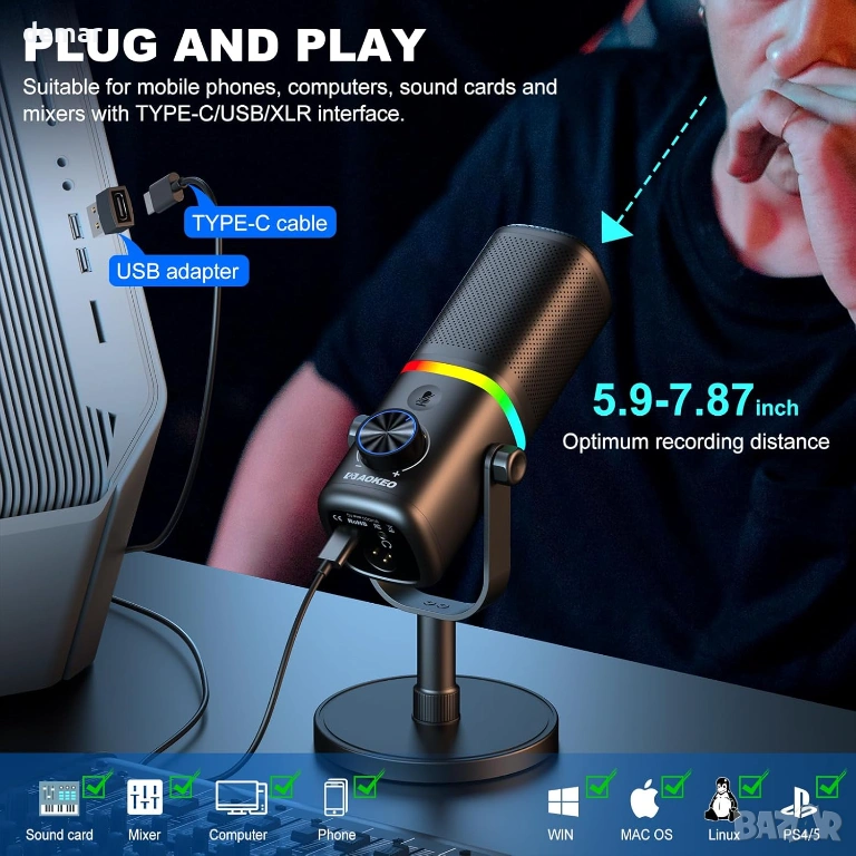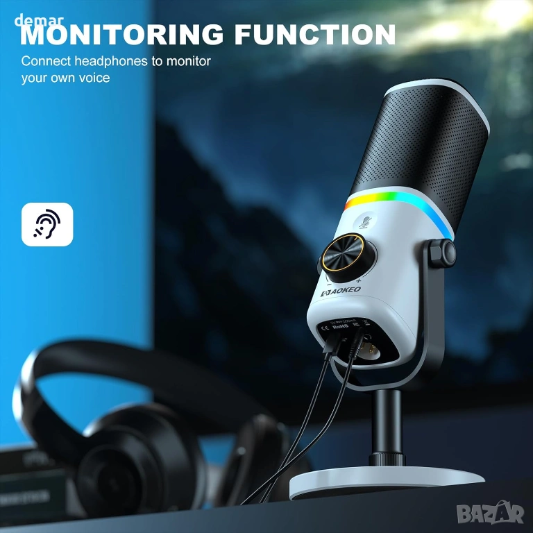 Микрофон Aokeo USB/XLR динамичен настолен микрофон с RGB светлина, бял