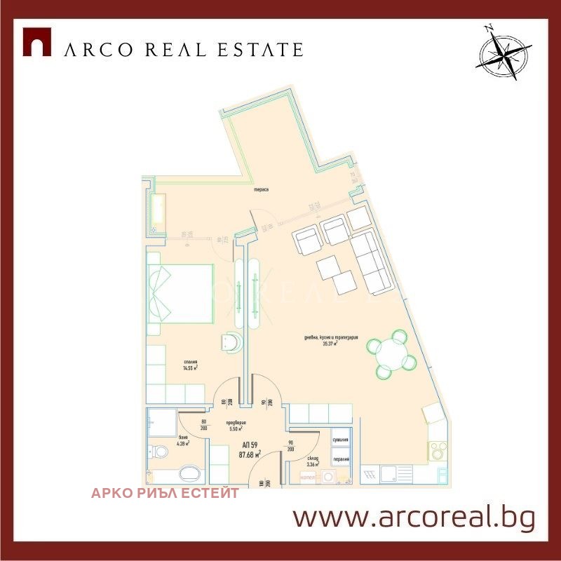 АRCO REAL ESTATE предлага за продажба 2-стаен апартамент, в ново строяща се жилищна сграда част от жилищен комплекс, разположен в зелен масив, в квартал Малинова долина, в близост до МОЛ RING и IKEA. Жилището се състои от: входно антре (5,50м2), хол с кухненска зона (35,50м2), отделна спалня (14,50м2),санитарен възел (4,3м2), склад (3,3м2), тераса (14,2). Има възможност да се закупи парко място в подземните два етажа. Агенцията работи по изискванията на БДС EN 15733. Предлагаме съдействие за ипотечно кредитиране и изготвяне на пазарна оценка на имота. Обадете се и заявете час за оглед: Сюзанна Кирова - 089450 59 33;02/9964312