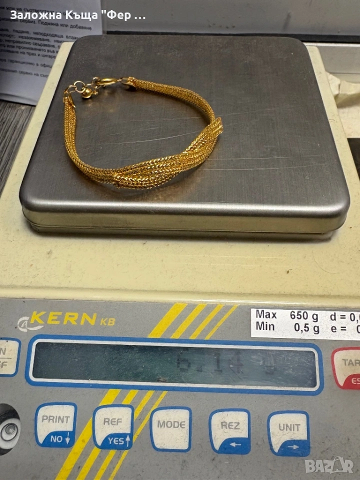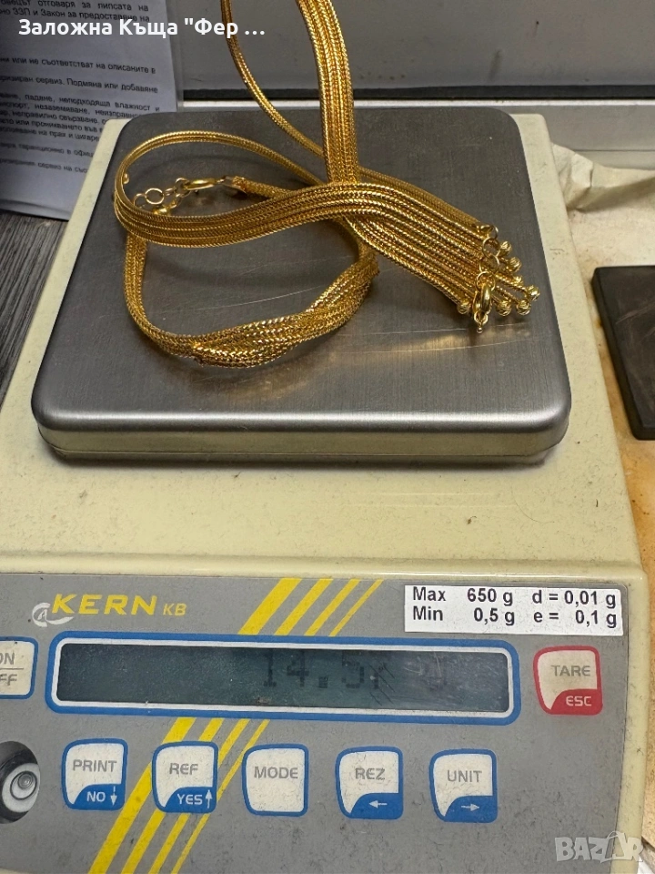 Продавам златен комплект от гривна и колие. 14 карата, проба 585 с печати (снимани). На снимките има и двете поотделно на везната и една с двата продукта над нея. Цената е 110€ за грам.