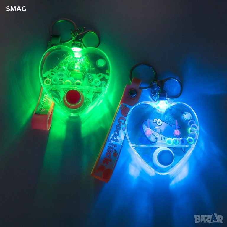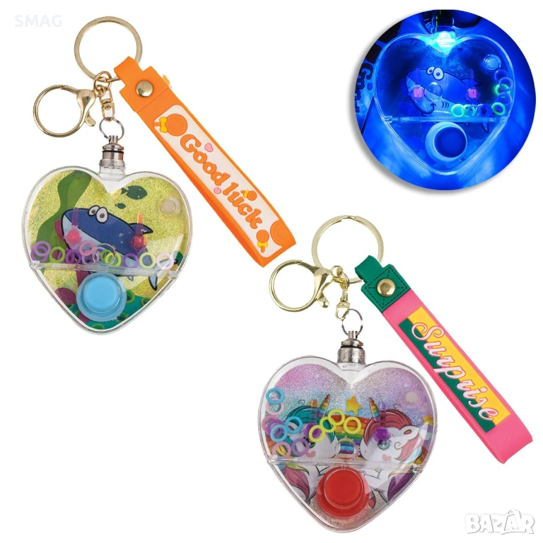 Забавна водна играчка във форма на сърце с цветен дизайн на еднорог и акула, която развива координацията и концентрацията на децата. Чрез натискане на бутоните малките халкички вътре в играчката се движат и подреждат, превръщайки играта в интересно предизвикателство. Вградената LED светлина се активира чрез завъртане на металния бутон и създава впечатляващ светлинен ефект, който прави играта още по-вълнуваща.