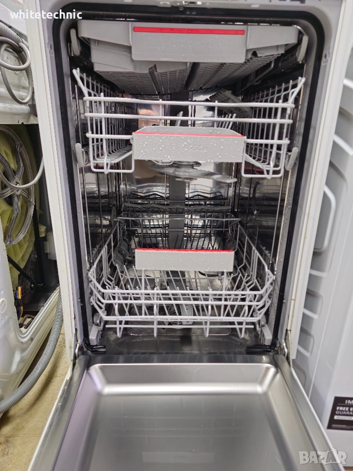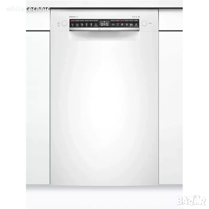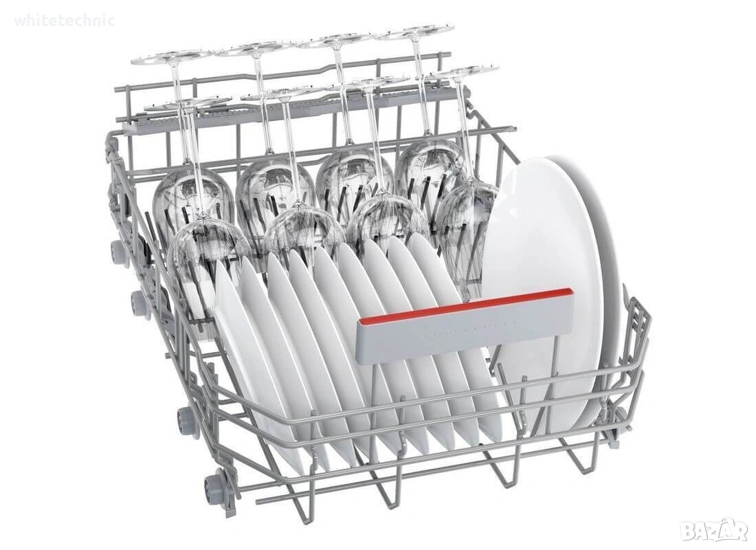VarioDrawer: сега вашата съдомиялна машина има още по-голяма гъвкавост - Понякога не можете да поберете това, от което се нуждаете, в съдомиялната си машина поради нейната негъвкавост. Издърпващата се горна кошница VarioDrawer осигурява трето ниво на зареждане, което решава този проблем. Тя е идеална за прибори за хранене и по-малки кухненски принадлежности, като бъркалки и черпаци. Дори чаши за еспресо се побират. Зареждането е по-гъвкаво и се освобождава повече място вътре, защото горната кошница замества кошницата за прибори за хранене в долната кошница, създавайки място за 14 комплекта чинии в съдомиялна машина с размер 60 см и 10 комплекта чинии в съдомиялна машина с размер 45 см. В резултат на това вашата съдомиялна машина ще позволи по-гъвкаво и удобно зареждане.Bosch Serie 4 SPU4HMW53S. Разположение на уреда: Напълно вграден, Размер на продукта: Тънък (45 см), Цвят на вратата: Бял. Брой комплекти: 10 комплекта, Клас на шумови емисии: C, Ниво на шум: 45 dB. Поддържани приложения: Bosch Home Connect. Клас на енергийна ефективност: A+, Консумация на вода на цикъл: 9.5 л, Консумация на енергия на 100 цикъла: 76 kWh. Ширина: 815 мм, Дълбочина: 448 мм, Височина: